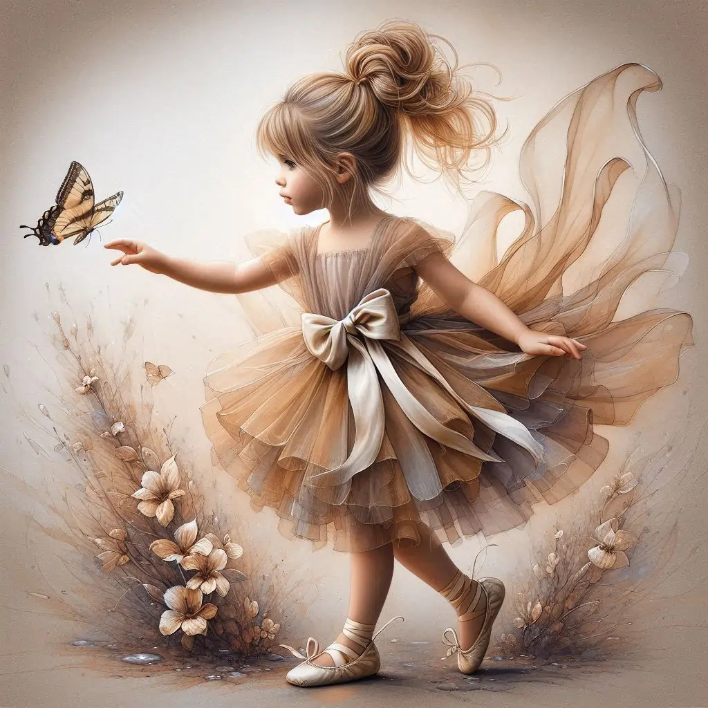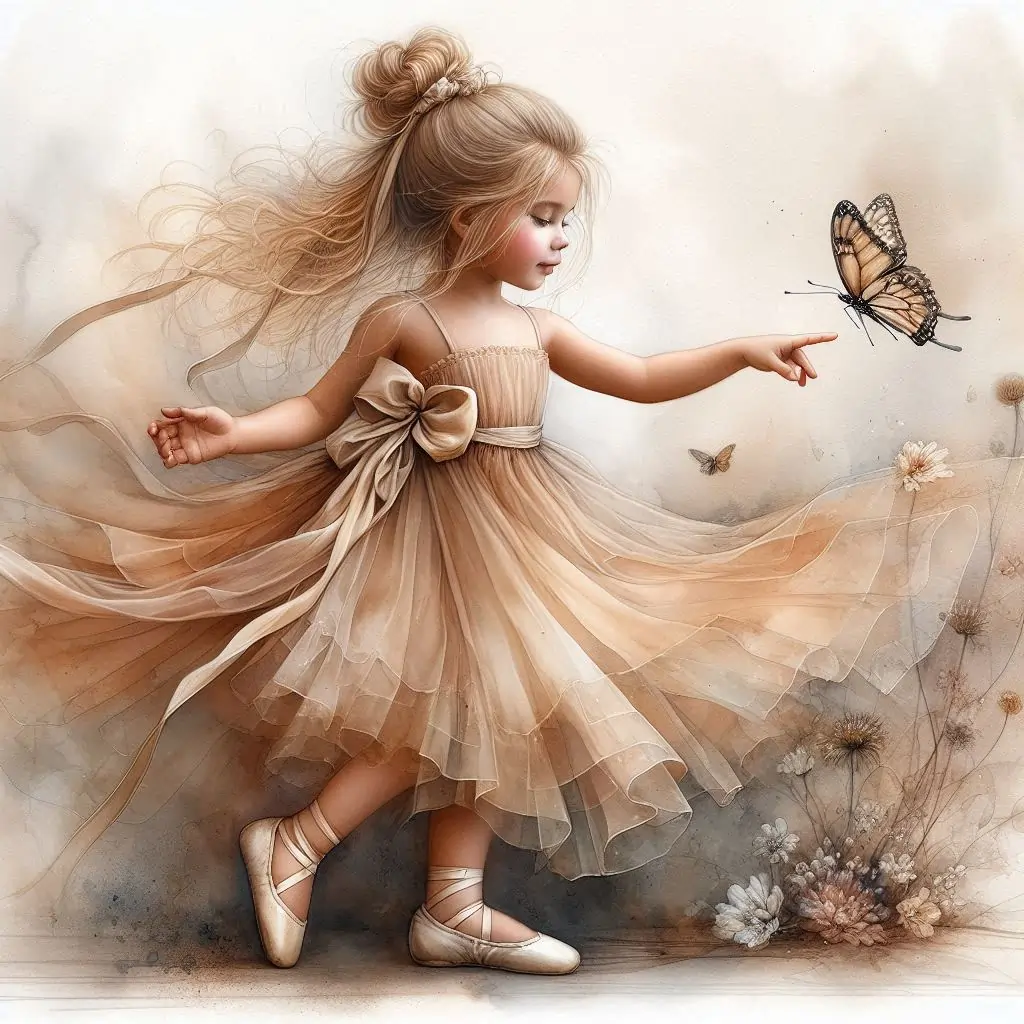 A beautiful little girl, golden hair pulled up in a messy bun silk long bow, wearing a soft chiffon layered dress, with long silk bow, in tans and cream, cream colored little silk ballerina shoes, reaches out to a small butterfly,flowers around, muted bg, highly detailed wispy and ethereal. hyper realistic 3D HD watercolor alcohol ink