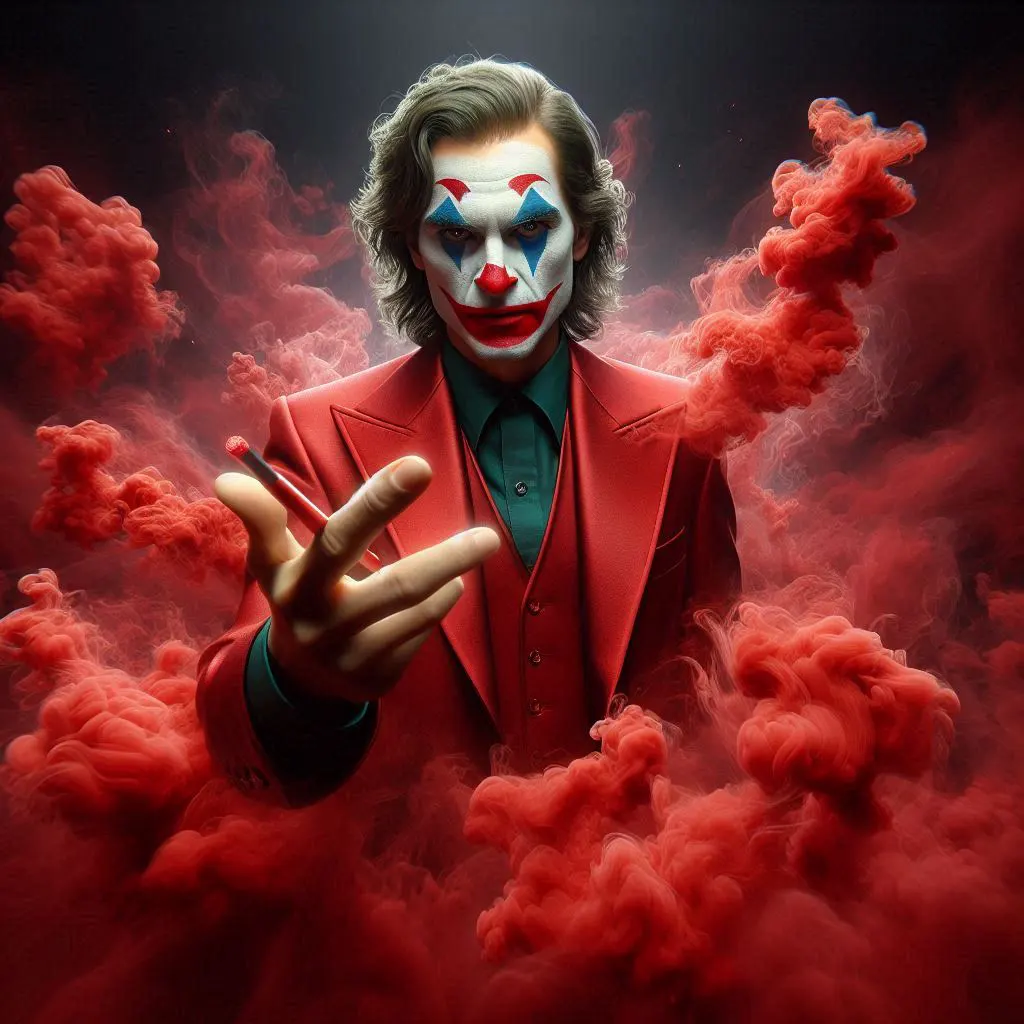 Create a hyperdetailed photorealistic macro image of a Joker. He looks contemporary, beautiful, and modern. He is portrayed in a red silk suite surrounded by red smoke.