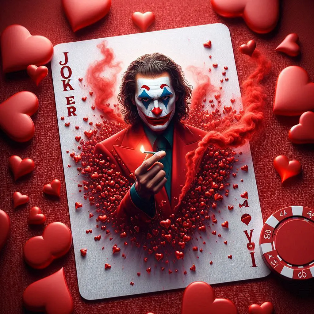 Create a hyperdetailed photorealistic macro image of a Joker playing card lying on a card table. Joker is composed entirely of multiple tiny hearts. He looks contemporary, beautiful, and modern. He is portrayed in a red silk suite surrounded by smokey red hearts and beckoning the viewer to enter the card with his finger emerging from the card in 3D along with red smoke. Add a red poker chip to the table.
