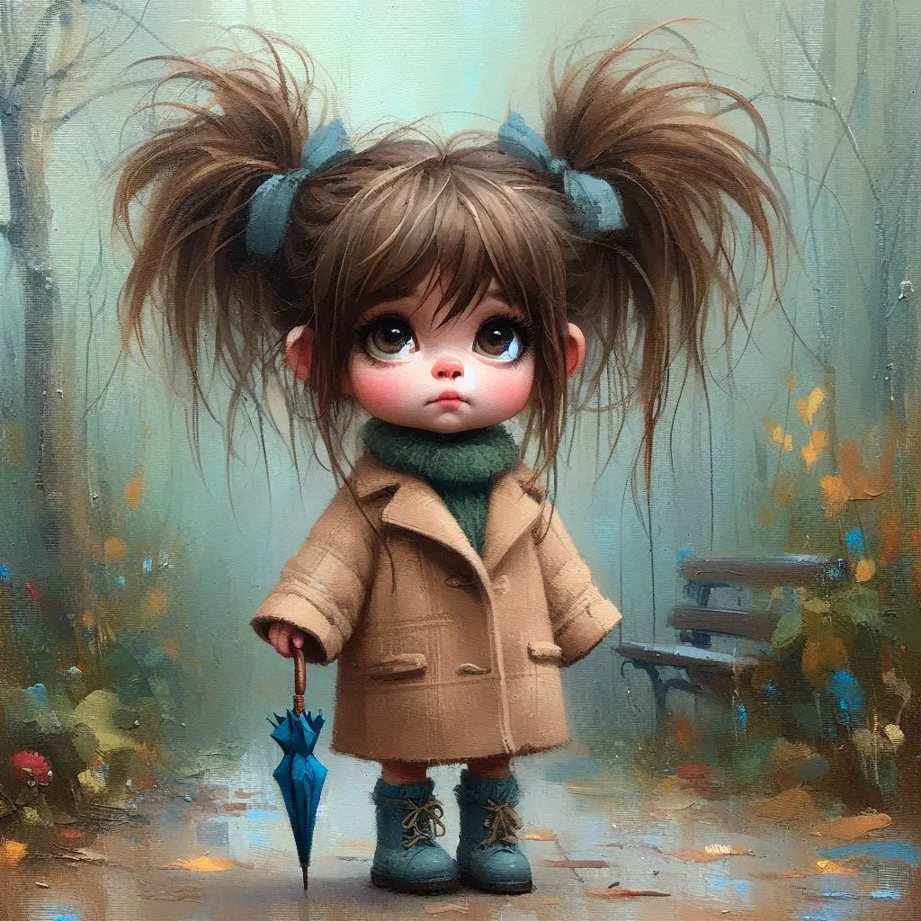 little midget girl with messy brown hair, pigtails with ribbons, beige coat, blue socks, boots, umbrella, bg greenery, soft and muted colors, acrylic and oil painting a whimsical