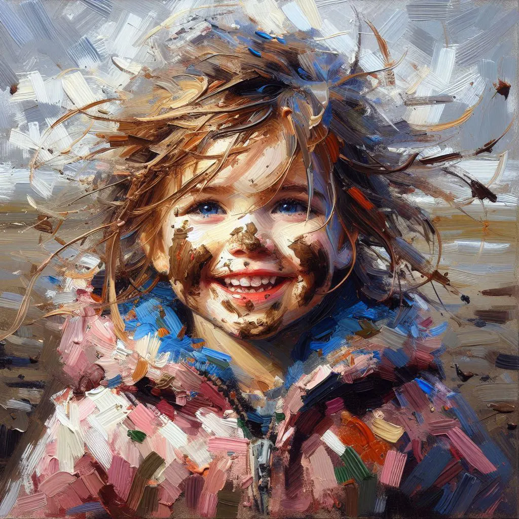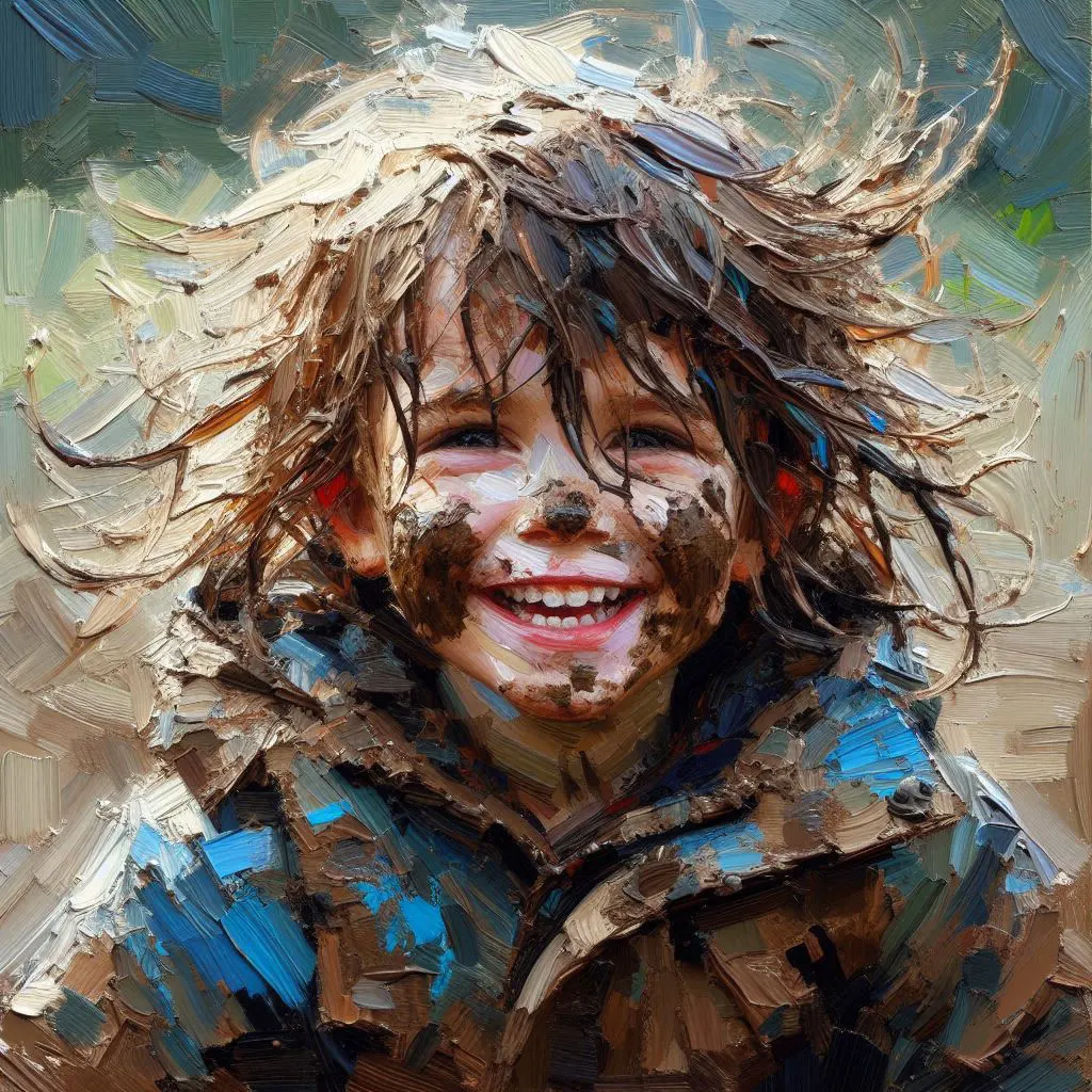 A portrait of a young child with mud on their face and clothes, smiling brightly with wind-blown hair, thick brushstrokes, impasto style, expressive art