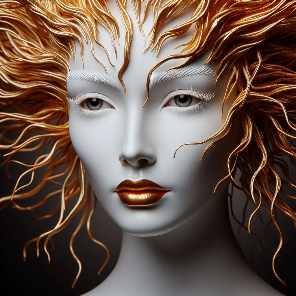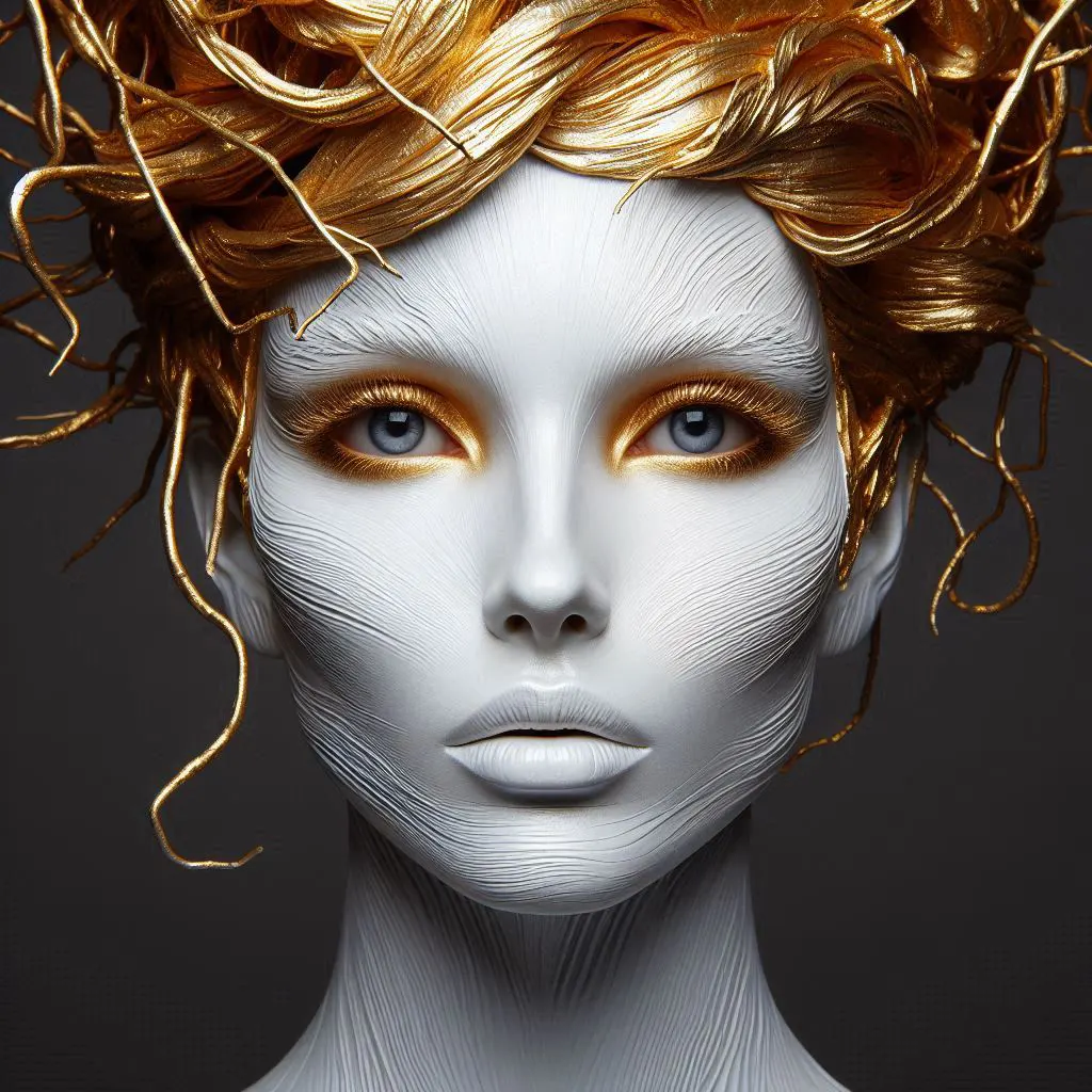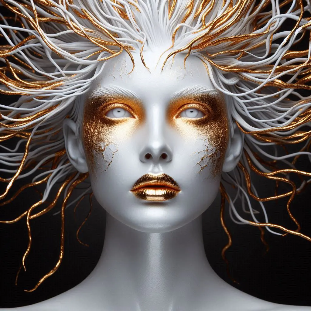 Biała, czysta, błyszcząca twarz bardzo wyjątkowej kobiety, której głowa i włosy były owinięte złotymi korzeniami, dramatyczna i dziwna sztuka, która była oszałamiająca.