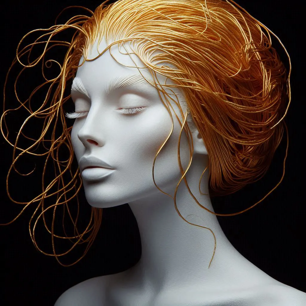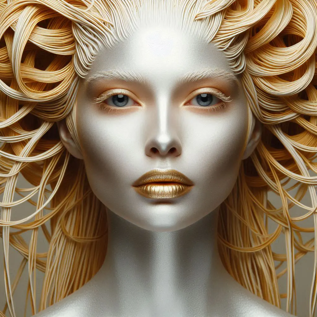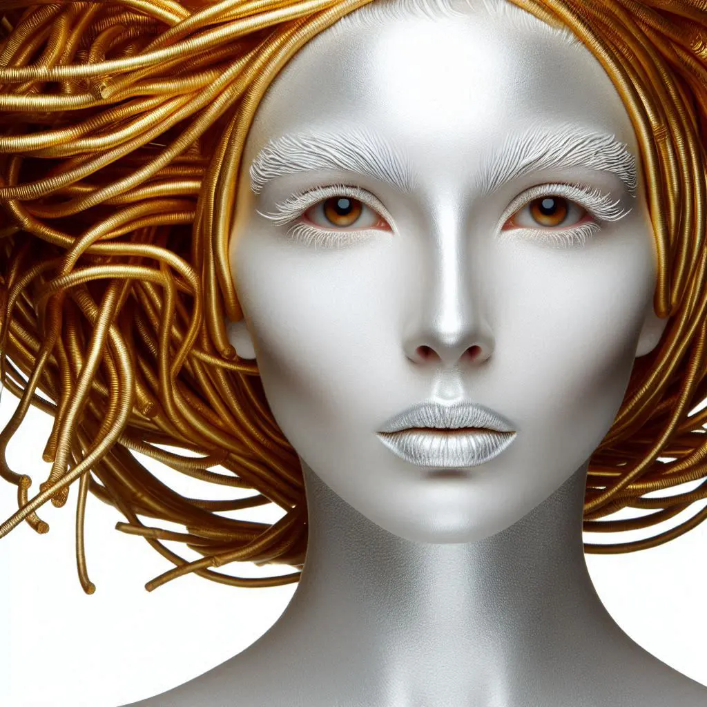 Biała, czysta, błyszcząca twarz bardzo wyjątkowej kobiety, której głowa i włosy były owinięte złotymi korzeniami, dramatyczna i dziwna sztuka, która była oszałamiająca.