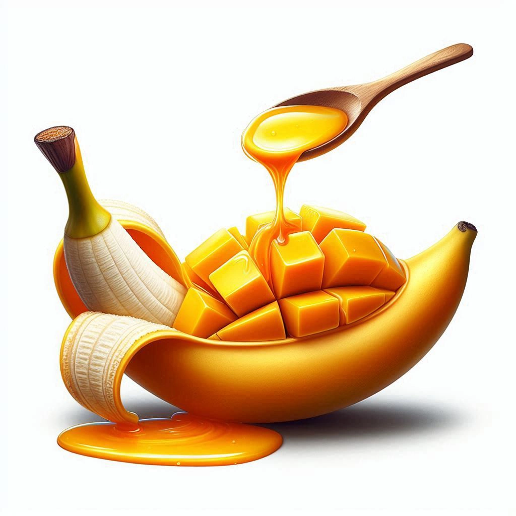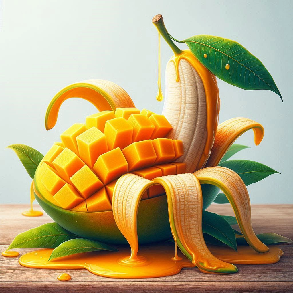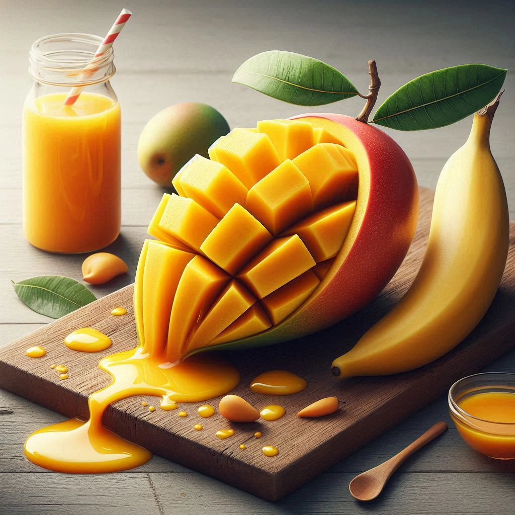 Create a vibrant super realistic image of a mango that is peeled like a banana, mango nectar is overflowing on the table.