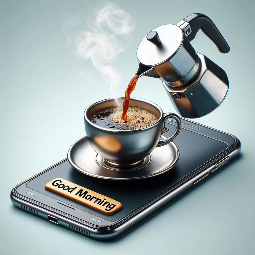 imagen de un celular con un letrero (Buenos días), de la pantalla del celular emerge una tasa plateada con su plato, la tasa contiene café, humo saliendo del café y una cafetera vierte café en la tasa, el celular está inclinado en ángulo de 45 grados