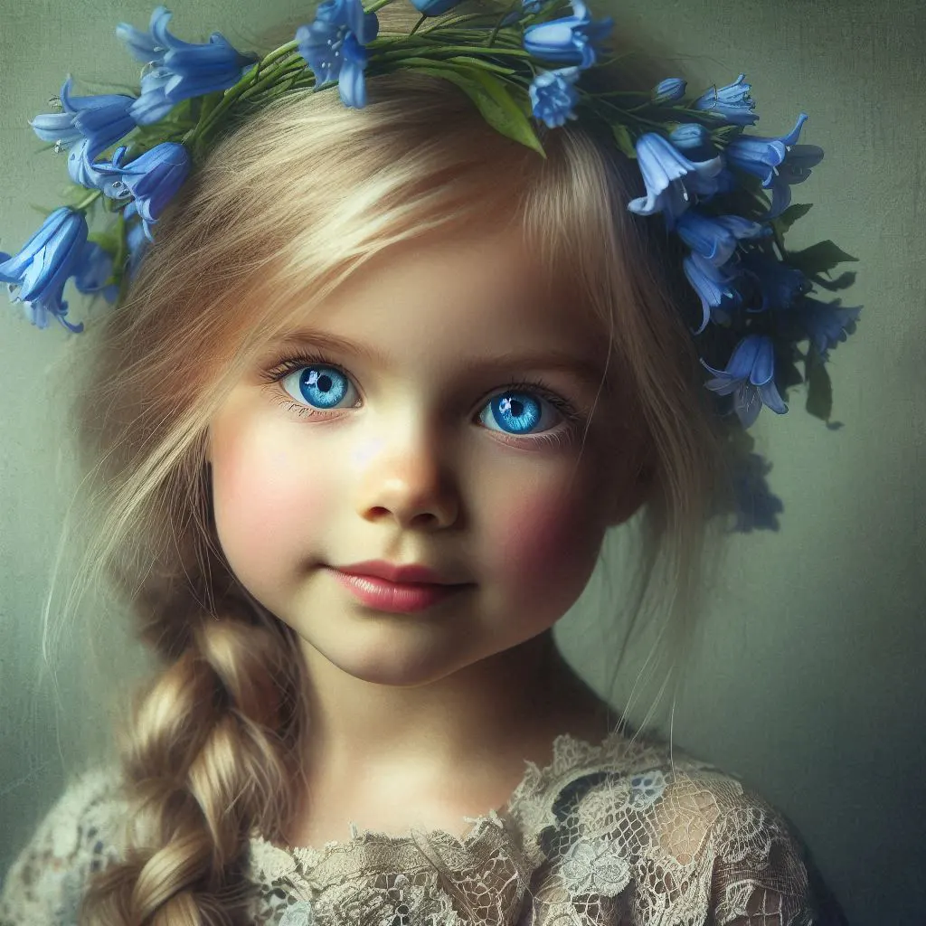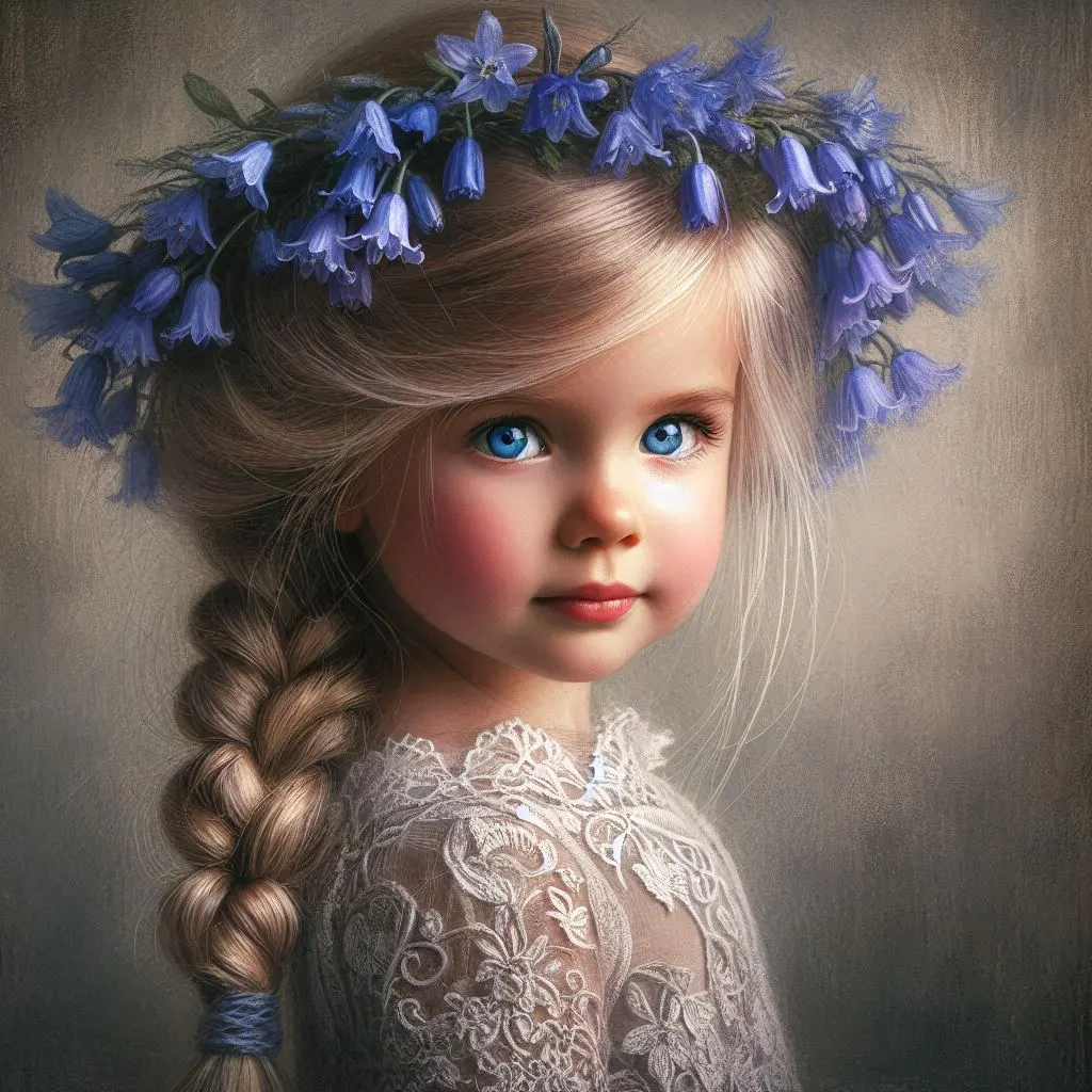 little girl with blonde hair, a braid, hair strands at the side of the face, blue eyes, Wreath of bluebells in her hair, wearing a chartuez with ornately detailed lace dress, bg is muted, highkey, chalk-art, detailed and textured