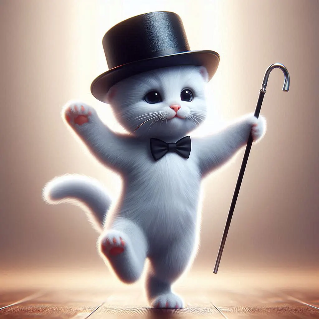 Biały, wesoły, uśmiechnięty kociak ma na głowie czarny cylinder, w ręce ma laskę, stoi w pozycji tanecznej Fred Astair, realistyczne, kociak jest prawdziwy, głębia ostrości