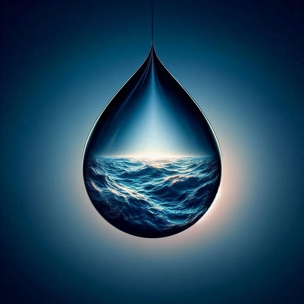 A macro photography image of a tear drop that encapsulates the vastness of the ocean within it