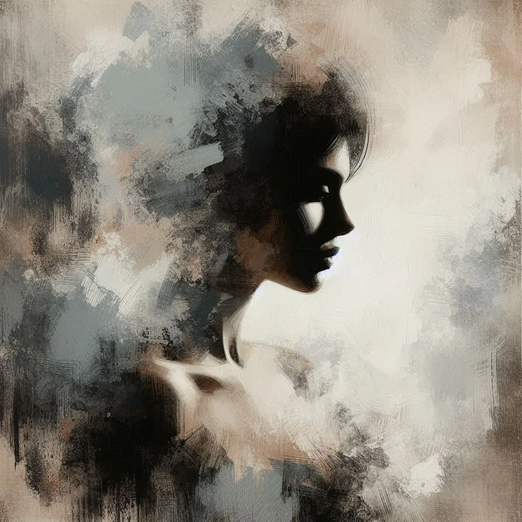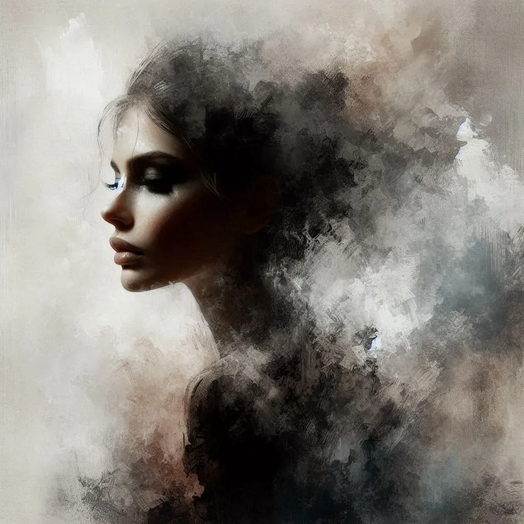 Artistic portrait of a woman, her face blending into an abstract, textured background. The style is a blend of realism and abstract impressionism, with rough, painterly strokes around the edges. She stands in a mysterious, side-profile pose. The color palette is muted, consisting of beige, gray, black, and white, creating a stark, contrasting look that emphasizes the silhouette of her figure. There is a soft, almost smoky effect in the background that merges with her figure,