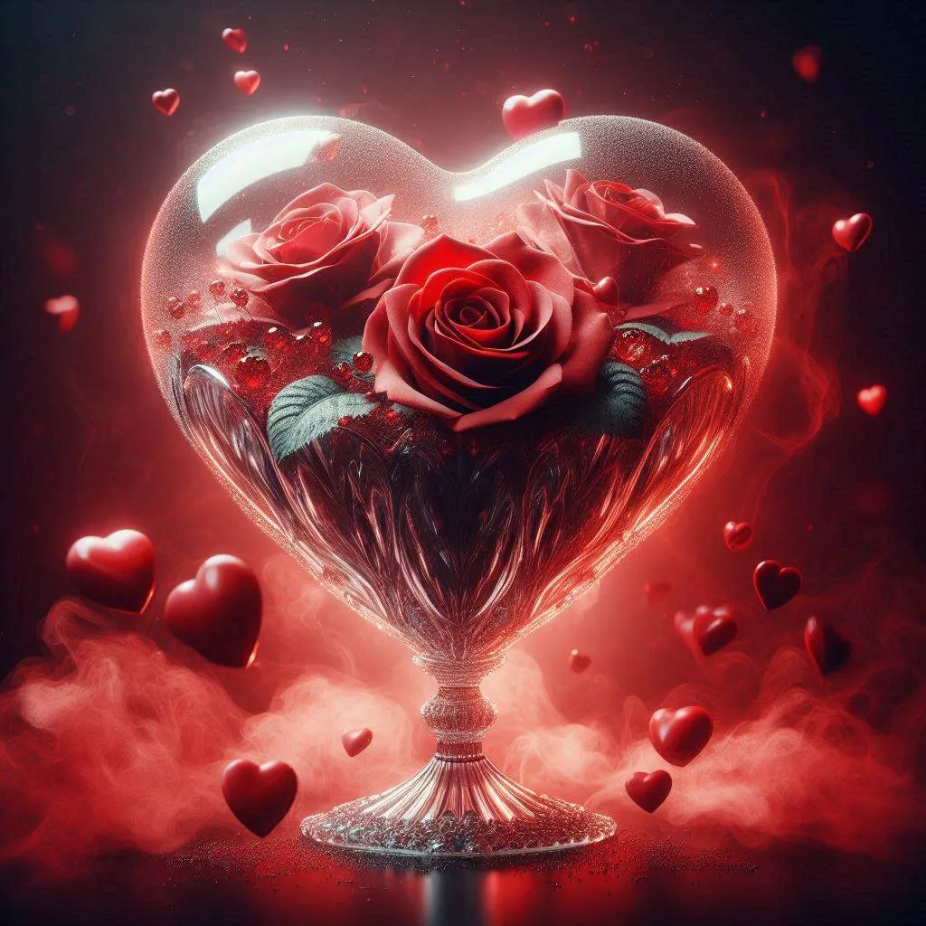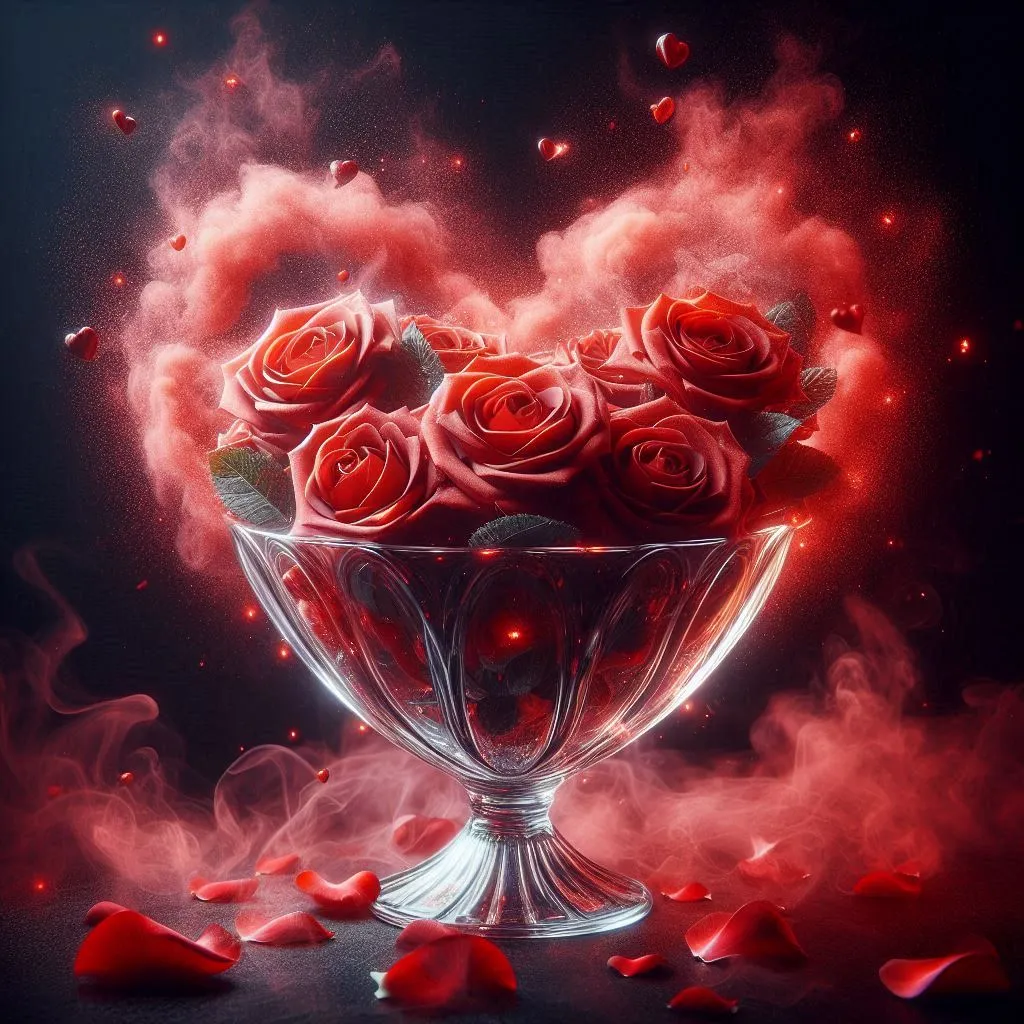 ultra realistic detailed heart-shaped glass bowl with a red roses flowers inside. glass bowl is surrounded red smoke, background is dark. effect bokeh,