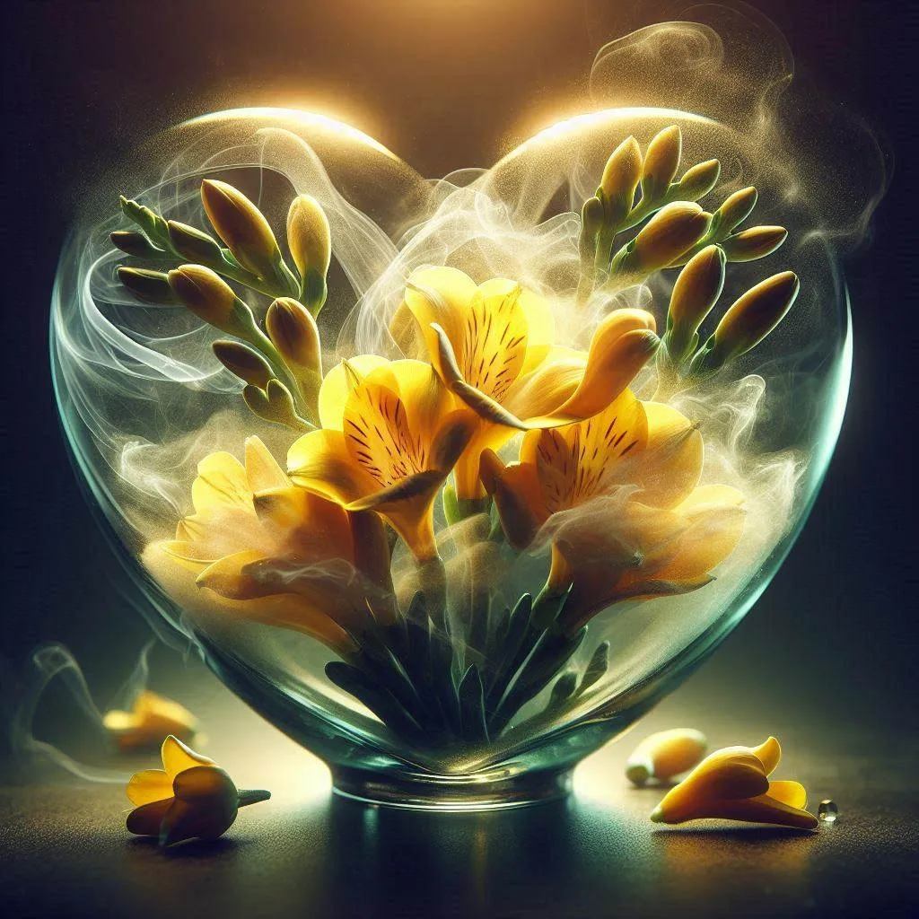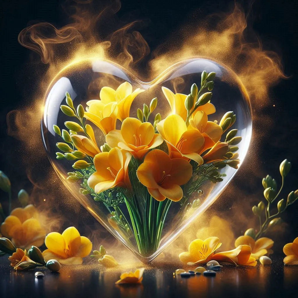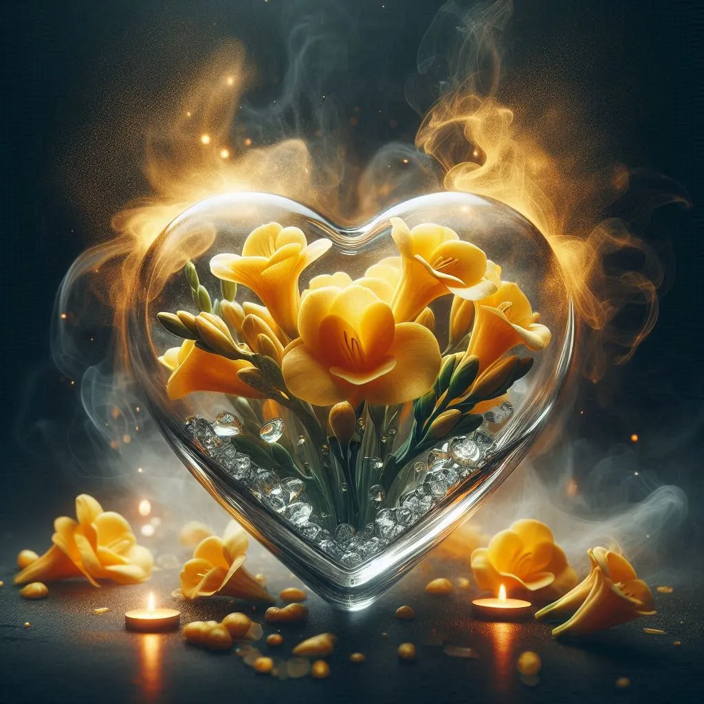 ultra realistic detailed heart-shaped glass bowl with a yellow freesias flowers inside. glass bowl is surrounded yellow smoke, background is dark. effect bokeh