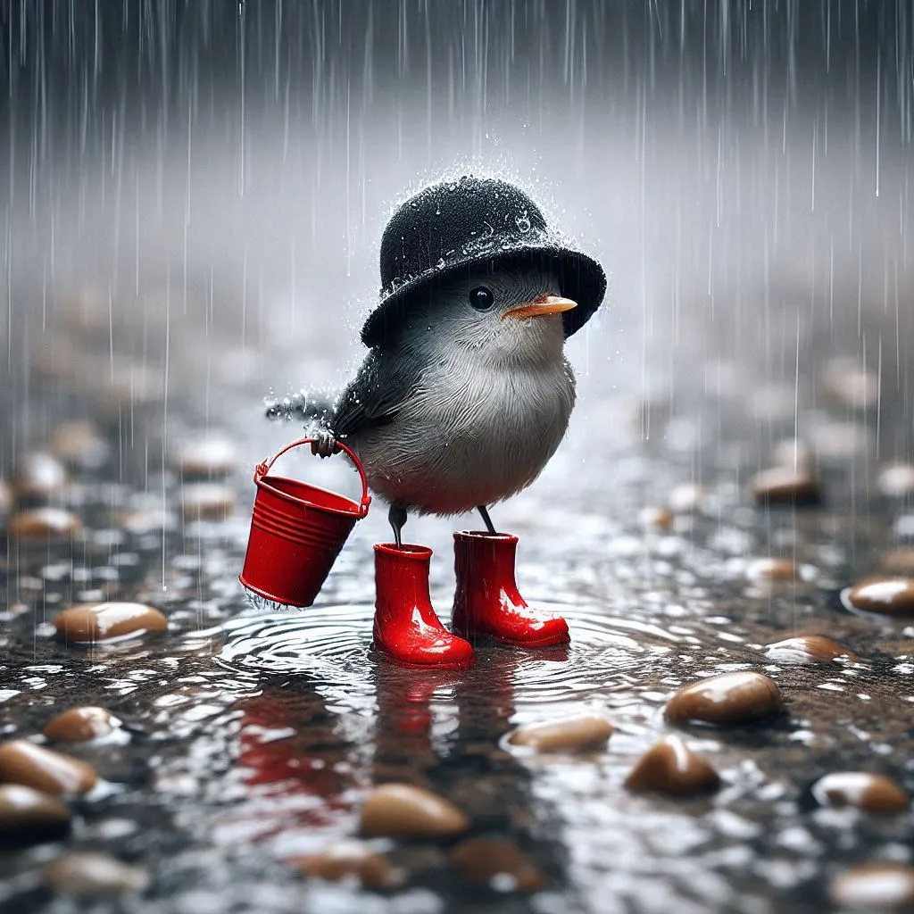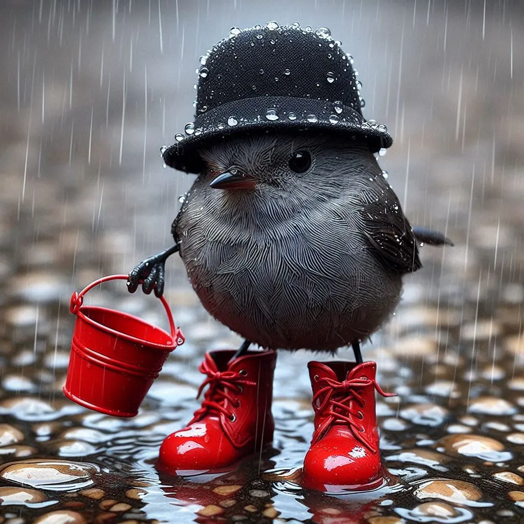 Create a hyper-realistic image of a small bird wearing a black hat and red boots, standing on wet pavement. The scene is set during rainfall with water droplets visibly falling around and splashing upon the ground. The bird holds a red bucket in its beak, which matches the color of its boots. The overall color scheme is monochromatic with shades of gray, except for the striking red of the boots and bucket which stand out vividly. There are small pebbles scattered on pavement