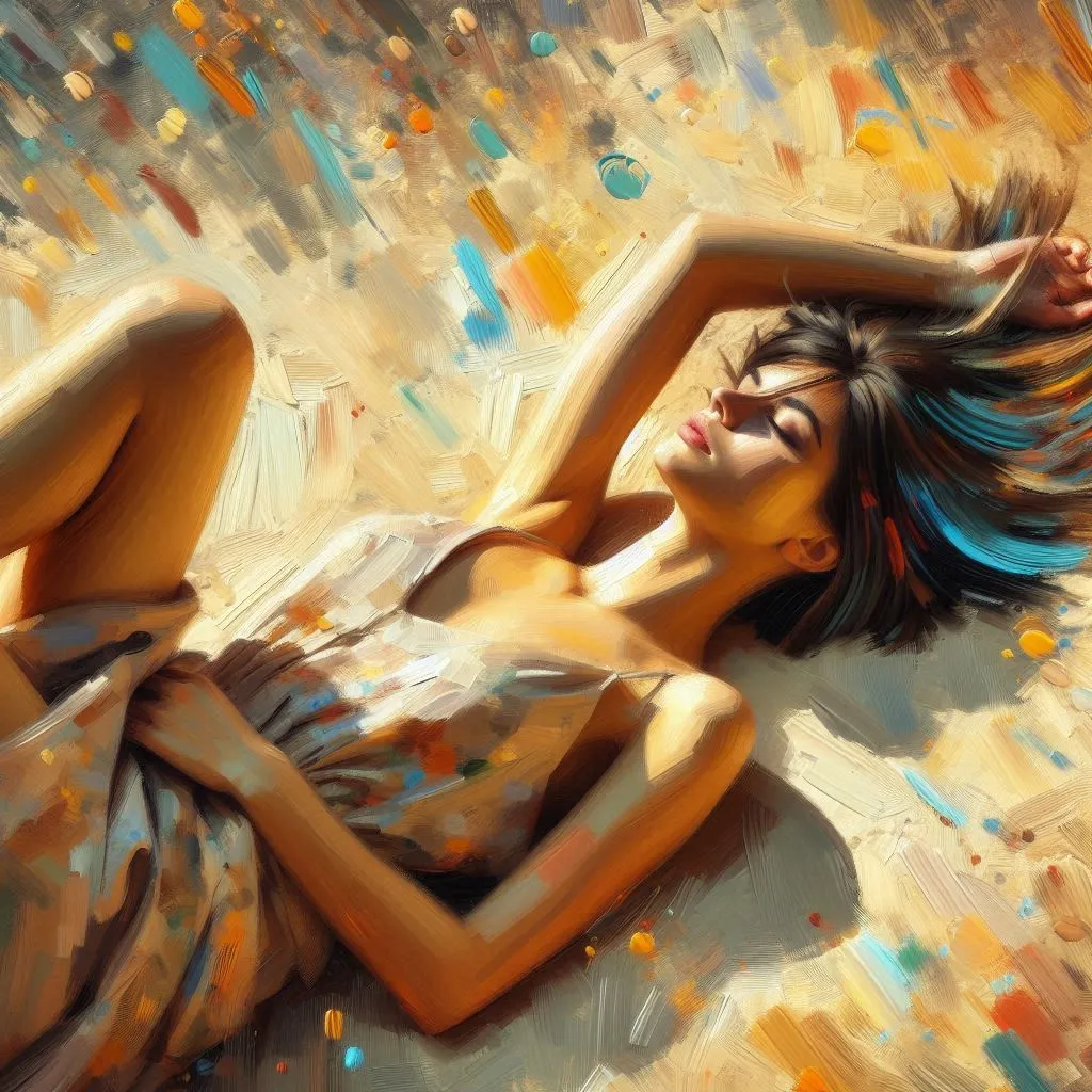Impressionist art. Loose brushstrokes. Young Polish woman. Short bob haircut. Sleeveless dress. Barefoot. Lying on her back. Flowing hair. Windy moment. Soft golden light. Playful. Vibrant colors. Radiant skin tone. Dreamy vibe. Energetic composition. Textured surface. Soft edges. Paint splatters.