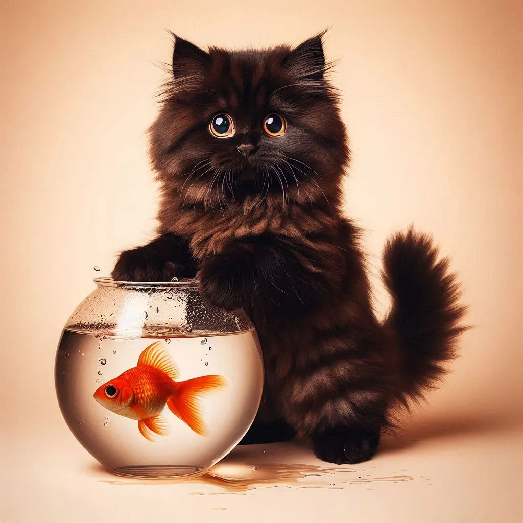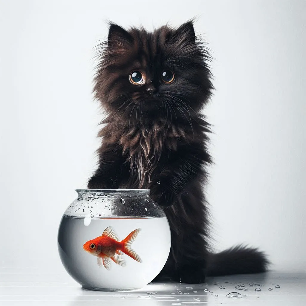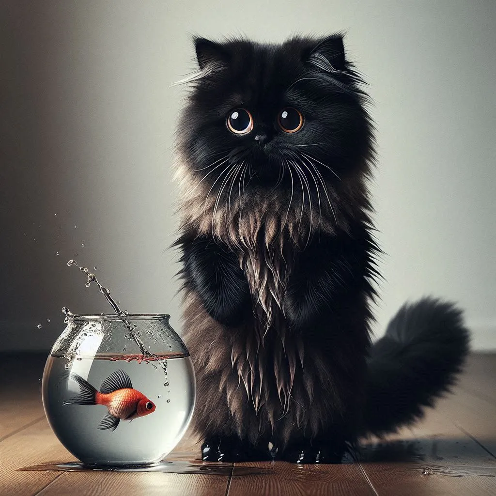 a black fluffy cat standing up on its back legs with the look of guilt holding a fishbowl with a fish in it and wide innocent-looking eyes and fur pattern of stripes and slightly tilted fishbowl and water splash around the fishbowl and on the floor