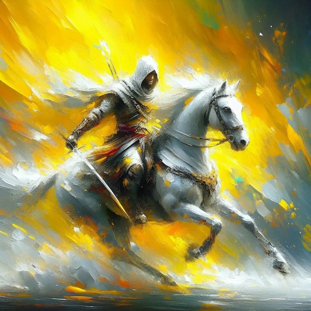 A vibrant high-contrast oil painting, a fantasy concept with vibrant lighting effects & blurred composition, white, yellow and grey colors, and vividly vibrant yellow accented light reflections on horse & rider from the side. chromatic-yellow & grey with textured brushstrokes and blurred edges Assassin’s Creed character on horseback in a dynamic action scene, against a stylized yellow background with dramatic brushstrokes, in a fantasy art style, set on a simple background.