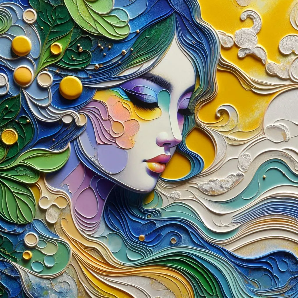 壓克力石膏油畫,一個女孩充滿活力的氣質,臉部精緻細緻,具有大膽的筆觸和分層的紋理。 亮黃色和藍紫色色調的對比使主題變得流行。(大星芹)葉、有機、點綴流動的形式,背景雲彩柔和光芒,營造出流動感和諧感。 整體美學異想天開而又現代