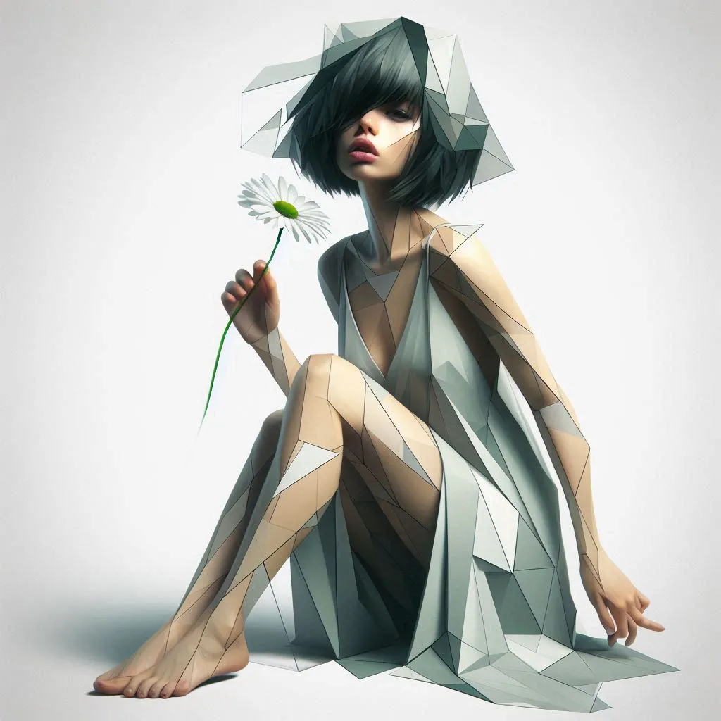Surrealism mixed-media. Pale green and grayish silver. Quirky. young woman. Short choppy black hair. Sleeveless flowing dress. barefoot. Leaning to the side. Holding a single daisy. Angular geometric strokes. Soft lighting effects. Relaxed and airy feel. High clarity.