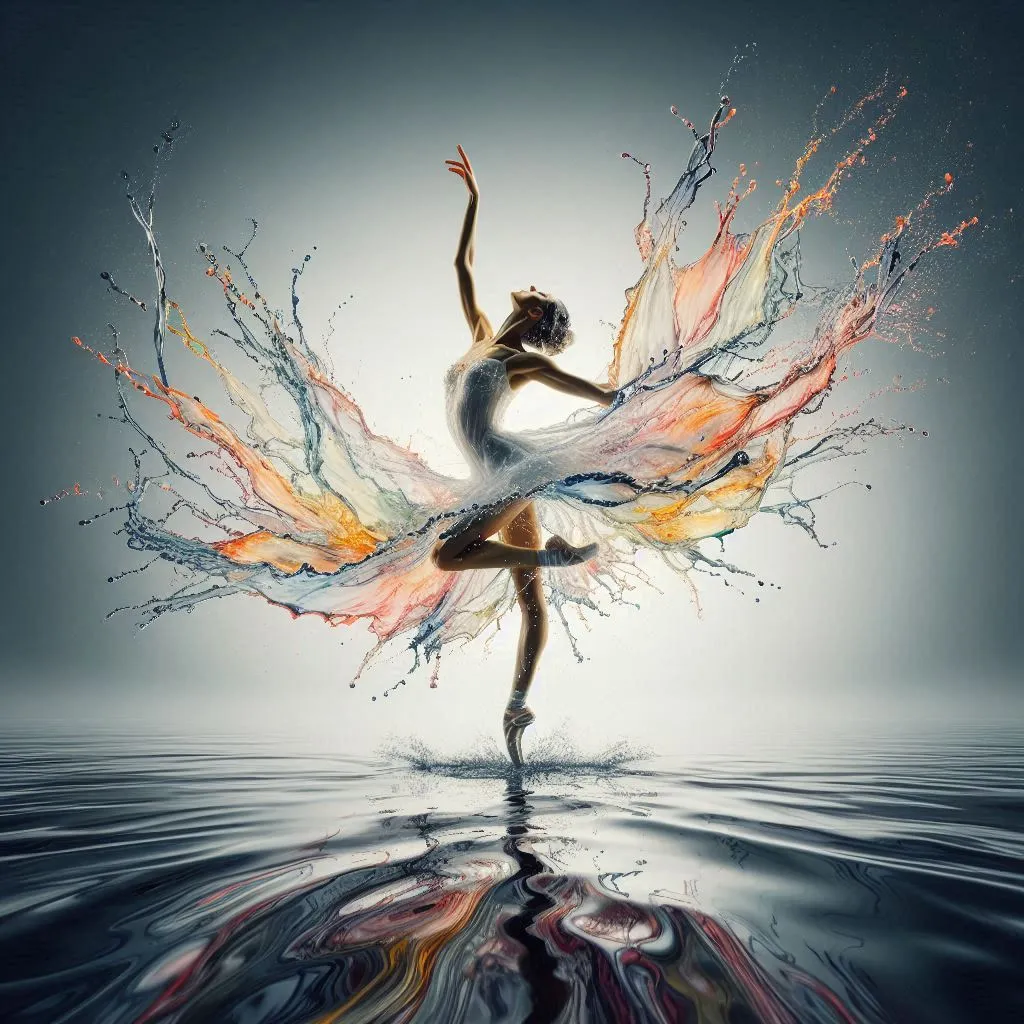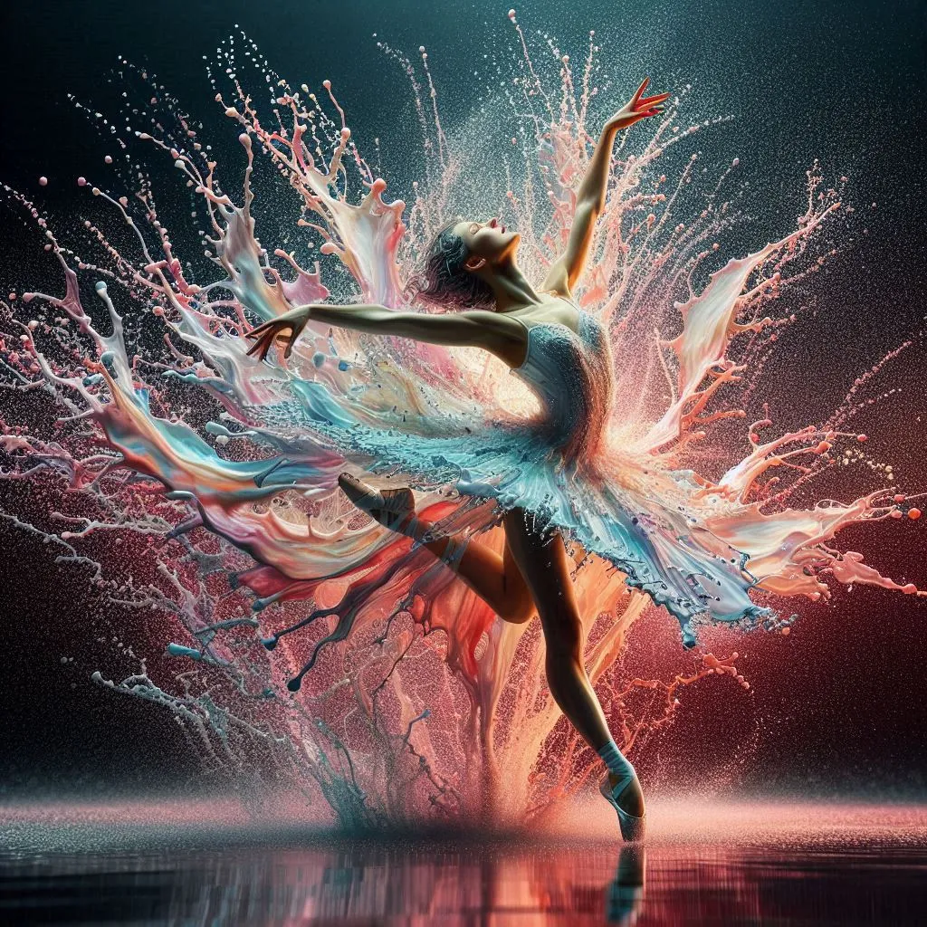Macro of woman dressed in dancing ballet choreography in full color hyperrealistic movements, random water explosions like a masterpiece, she dances on a glossy white floor, the background is depth of field