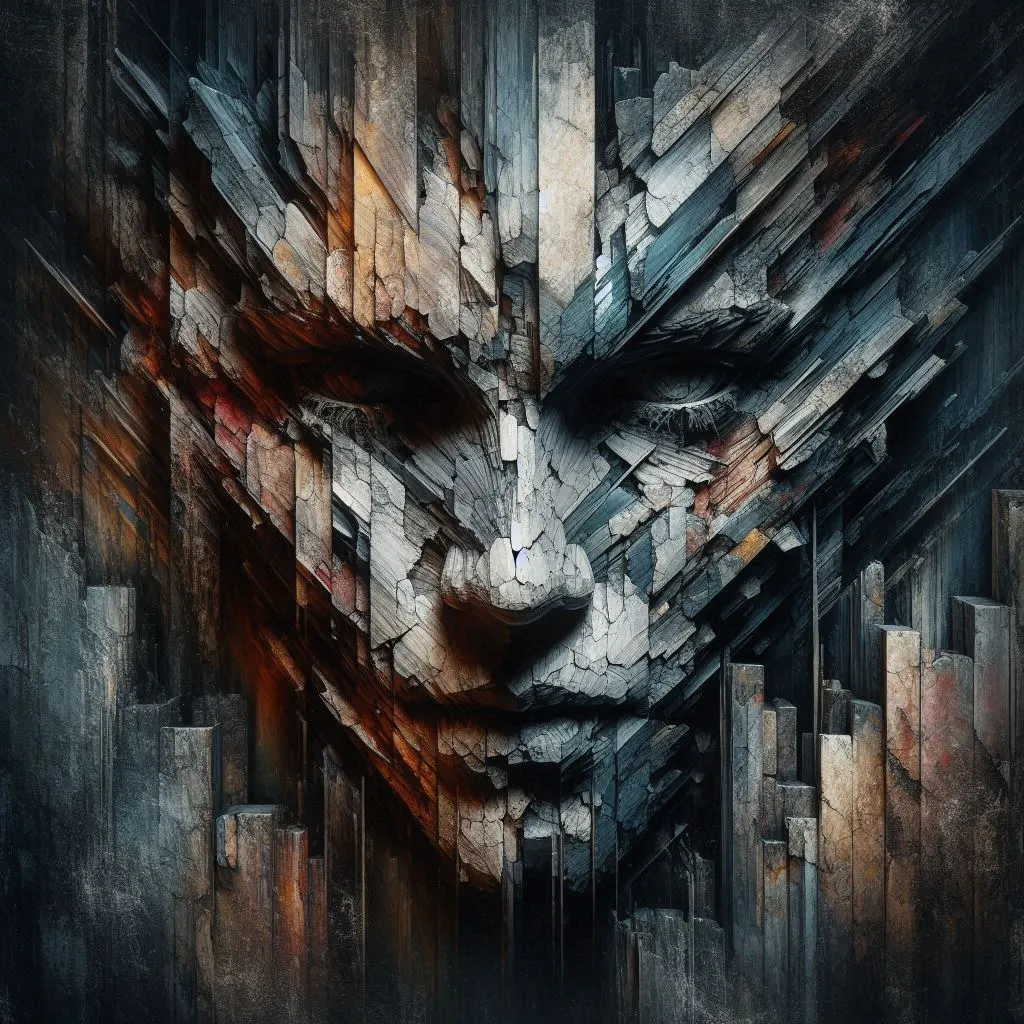realistic, detailed, accurate, hdr, 3D render, artwork, a haunting, surreal depiction of a face emerging from a fractured, distressed composition. The image combines elements of abstract expressionism and dark surrealism, with a striking blend of bold colors and harsh textures.