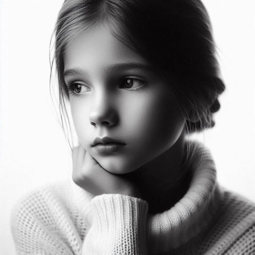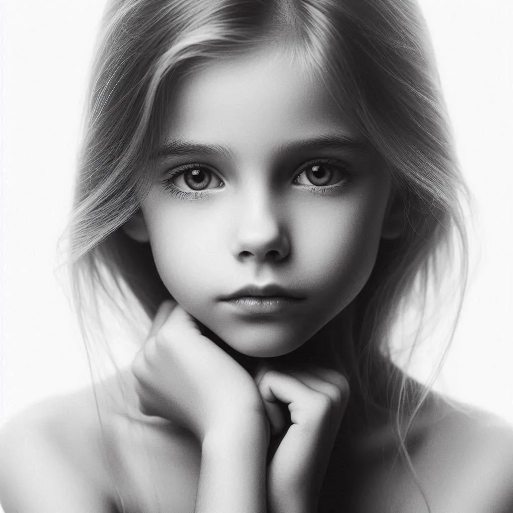 high key black and white portrait, minimalism, dreamy, pensive, beautiful, XX-years old polish girl, realistic, white background,