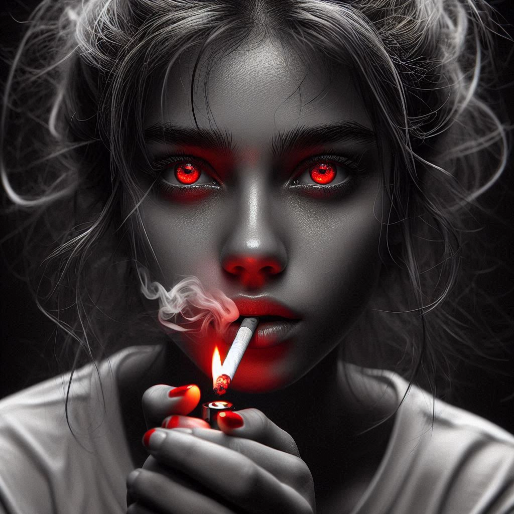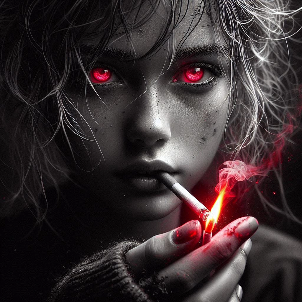 A hyper-realistic, ultra-high-definition black-and-white photograph of a young girl with messy hair holding a lit cigarette. The image is captured with intricate lighting and deep shadows, creating a high-contrast effect. A color splash effect is applied, featuring vivid, intense red on the lit tip of the cigarette and in the girl’s eyes, which match the color of the flame. The rest of the scene remains in monochrome, emphasizing dramatic contrasts. The red eyes serve as a striking focal point against the black-and-white background, adding to the intensity of the atmosphere. The scene focuses on detailed textures, highlighting the girl’s expression and the glowing red elements.