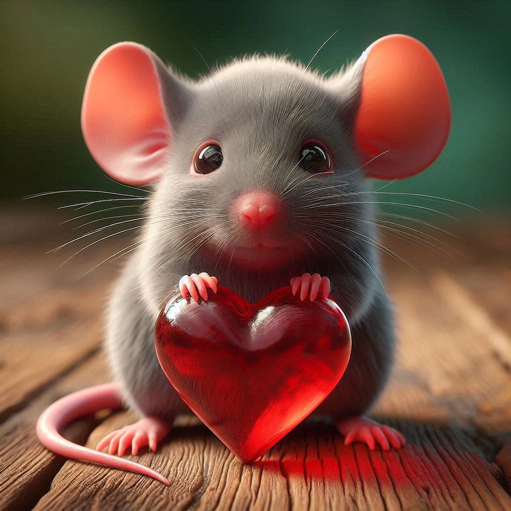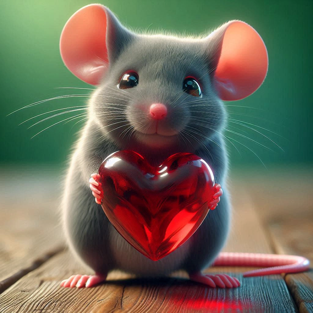 Hyper realistic, full of detail, close-up of a small mouse standing on a wooden surface. The mouse is grey in color and has a pink nose and mouth, and very short tail. It is holding a big, red, glossy, glass heart in its paws and is looking directly at the camera with a love expression. The background is blurred, but it appears to be a greenish-blue color. The overall mood of the image is playful and whimsical. 8K, HDR, Nikon Z9, depth of field