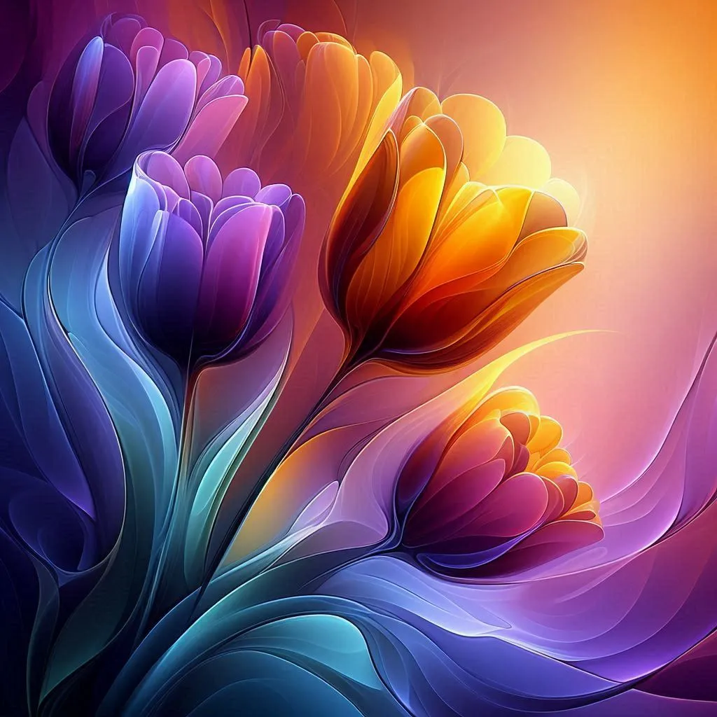 Create a vibrant, abstract representation of tulips in a glass-like quality, with petals reflecting shades of purple, orange, and yellow. The background should have soft, swirled gradients that complement the flowers, enhancing their luminous appeal. Focus on the interplay of light and color, giving a sense of depth and elegance, as if the flowers are emerging from a smooth, organic backdrop.