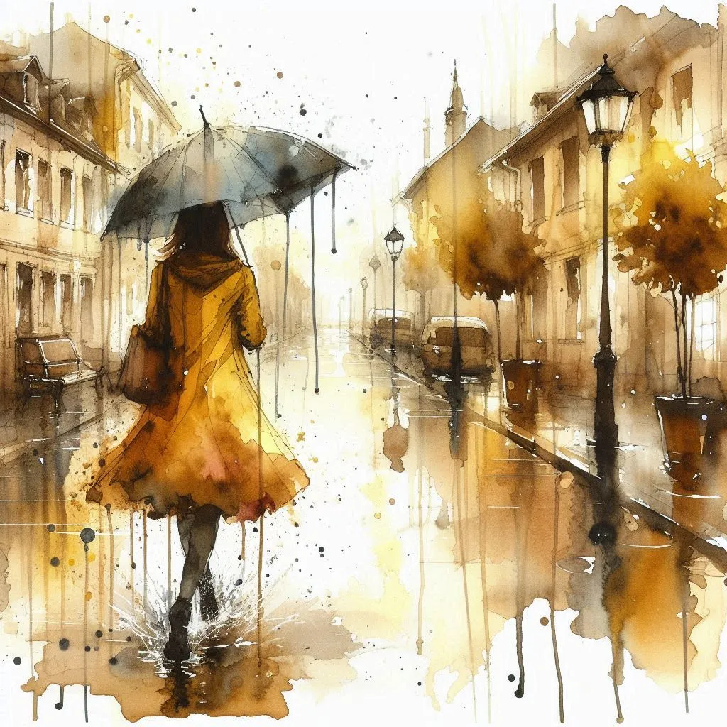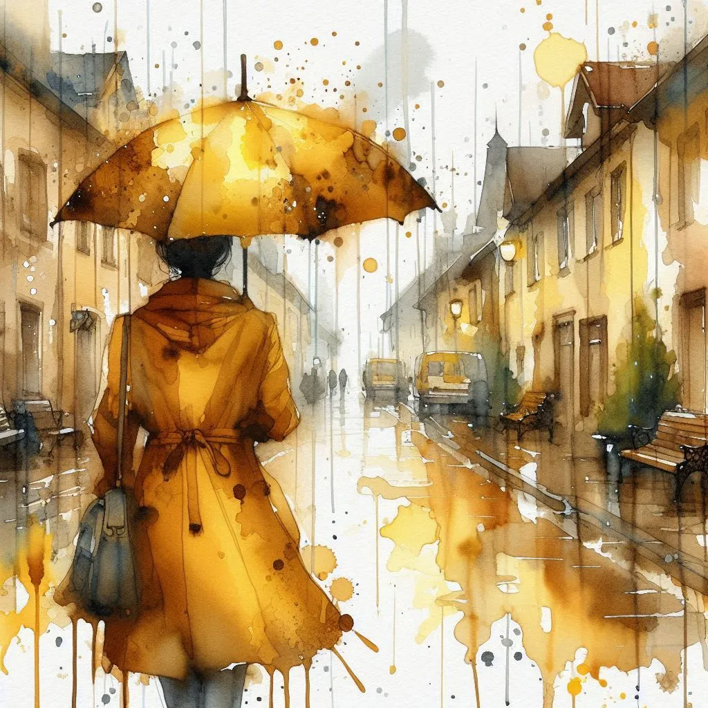 Watercolor Splash alcohol ink wet in wet brown and yellow tones, a woman wearing a yellow raincoat with a yellow umbrella walks down a street in pouring rain, the street is lined with houses