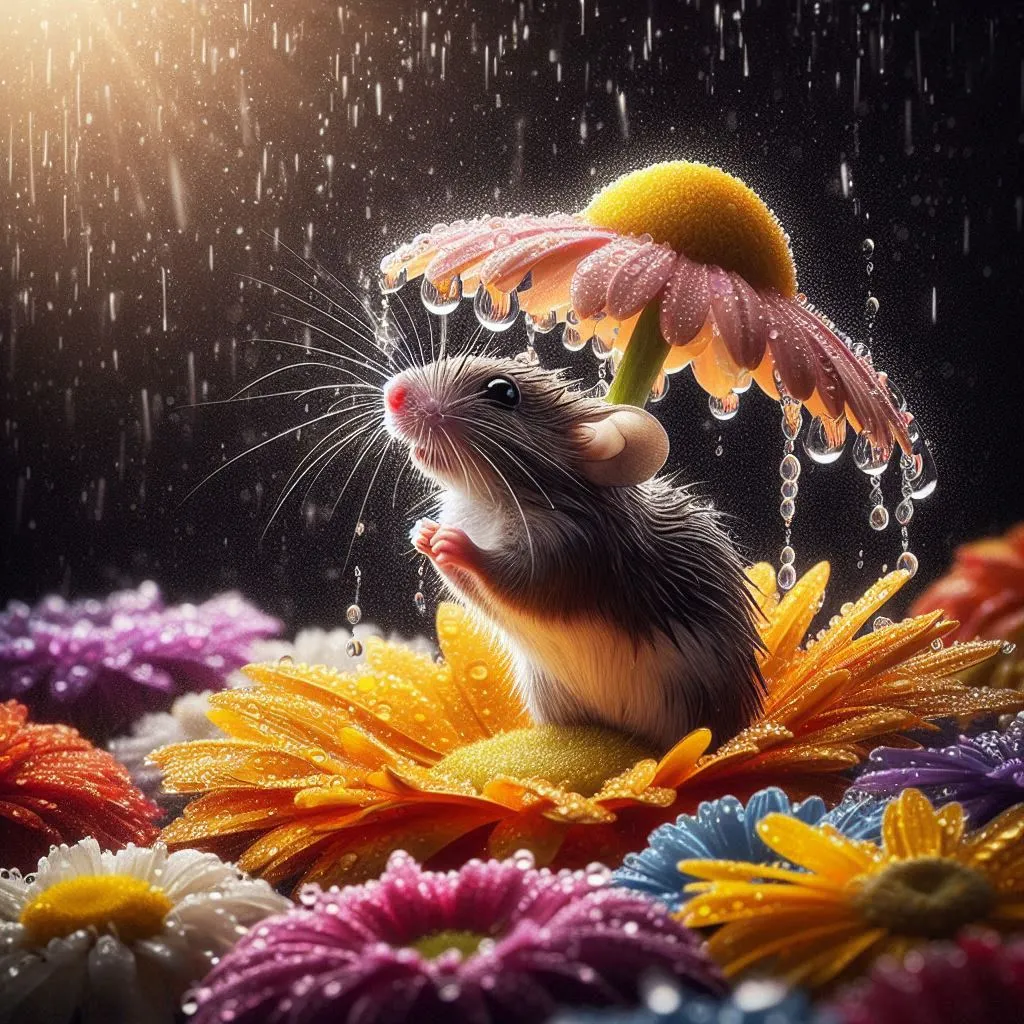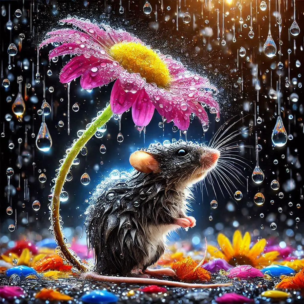 create a high definition image of raining scenery where a mice is under a flower soaking wet in a crystal style art mice is looking up the rain drops from the colorful daisy flower petals with black background