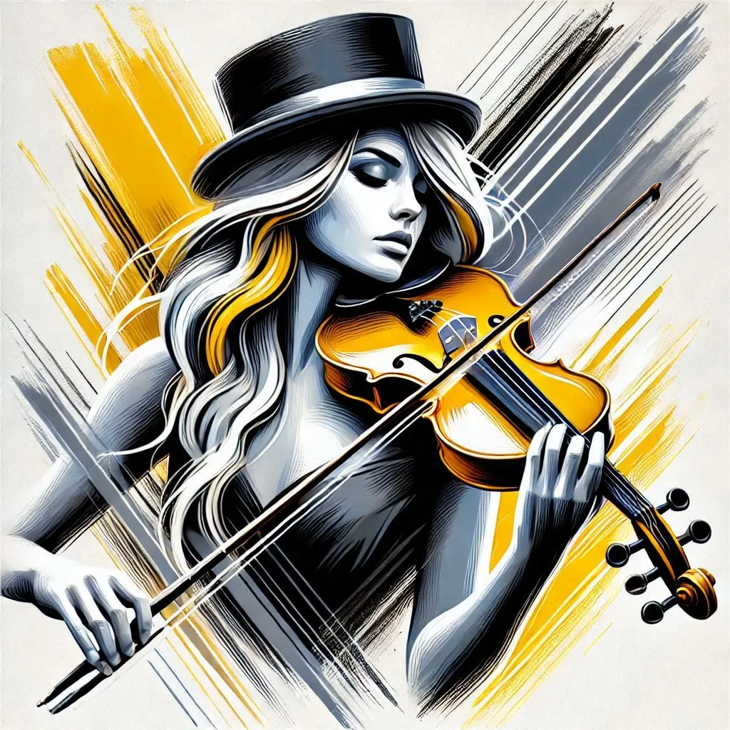 Une femme, placée au centre, est représentée dans un style stylisé et pictural. Elle porte un haut-de-forme gris foncé-noir et semble jouer du violon, sa posture et son expression suggérant un moment de concentration musicale. Ses longs cheveux blonds clairs et flottants flottent autour de son visage. La femme regarde vers le bas en direction du violon, avec une vue de trois quarts. L’image utilise des couleurs vives et audacieuses, notamment des nuances de jaune, de gris, de noir et de blanc. L’arrière-plan utilise des coups de pinceau abstraits, créant une composition dynamique et texturée. La lumière est diffuse, mettant en valeur la silhouette de la femme et le violon de manière dramatique. Le style évoque un sentiment de mouvement contrôlé et d’expression émotionnelle. Les reflets et les coups de pinceau texturés sont visibles dans toute l’image, créant de la profondeur. La perspective est légèrement au-dessus d’elle, soulignant sa pose artistique et le moment de la création musicale.
