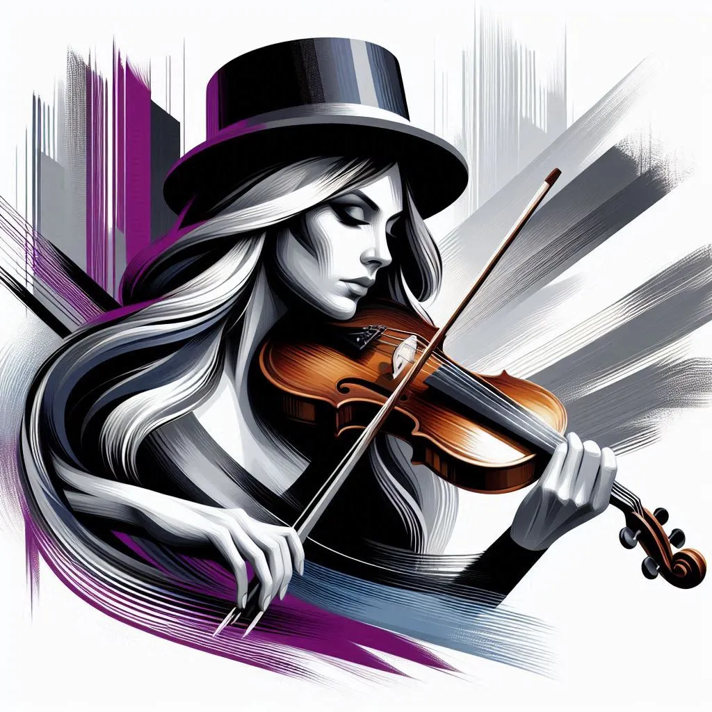 Une femme, placée au centre, est représentée dans un style stylisé et pictural. Elle porte un haut-de-forme gris foncé-noir et semble jouer du violon, sa posture et son expression suggérant un moment de concentration musicale. Ses longs cheveux blonds clairs et flottants flottent autour de son visage. La femme regarde vers le bas en direction du violon, avec une vue de trois quarts. L’image utilise des couleurs vives et audacieuses, notamment des nuances de violet, de gris, de noir et de blanc. L’arrière-plan utilise des coups de pinceau abstraits, créant une composition dynamique et texturée. La lumière est diffuse, mettant en valeur la silhouette de la femme et le violon de manière dramatique. Le style évoque un sentiment de mouvement contrôlé et d’expression émotionnelle. Les reflets et les coups de pinceau texturés sont visibles dans toute l’image, créant de la profondeur. La perspective est légèrement au-dessus d’elle, soulignant sa pose artistique et le moment de la création musicale.