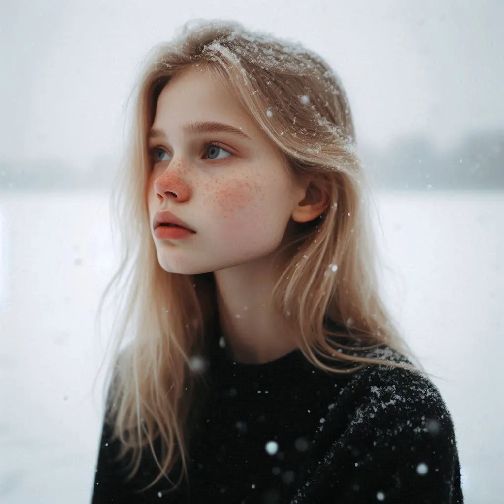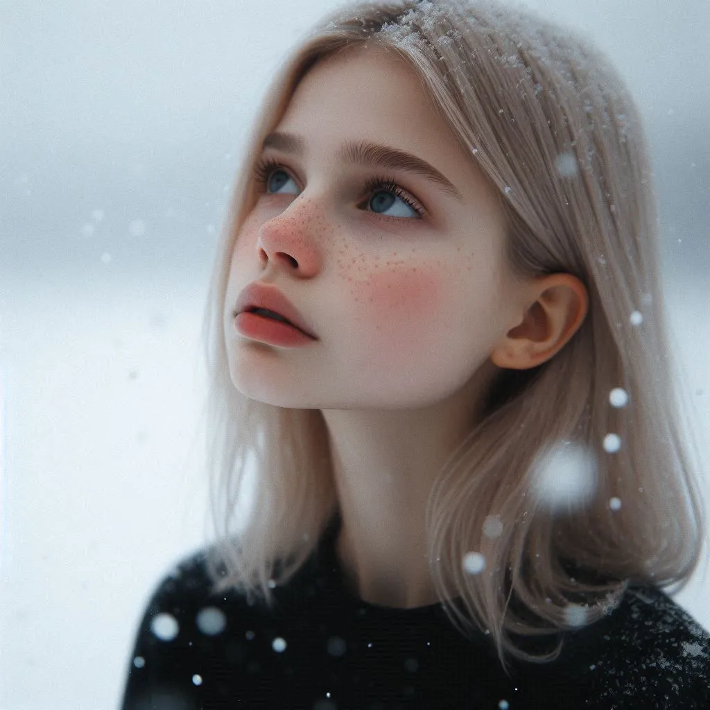 A Polish blond girl looks sideways and looks up at the sky with a sad expression. Her face is dotted with tiny snowflakes. The minimalist and blurry pure white snow background creates a quiet atmosphere. She is wearing black clothes. The scattered snowflakes and light spots add to the dream.