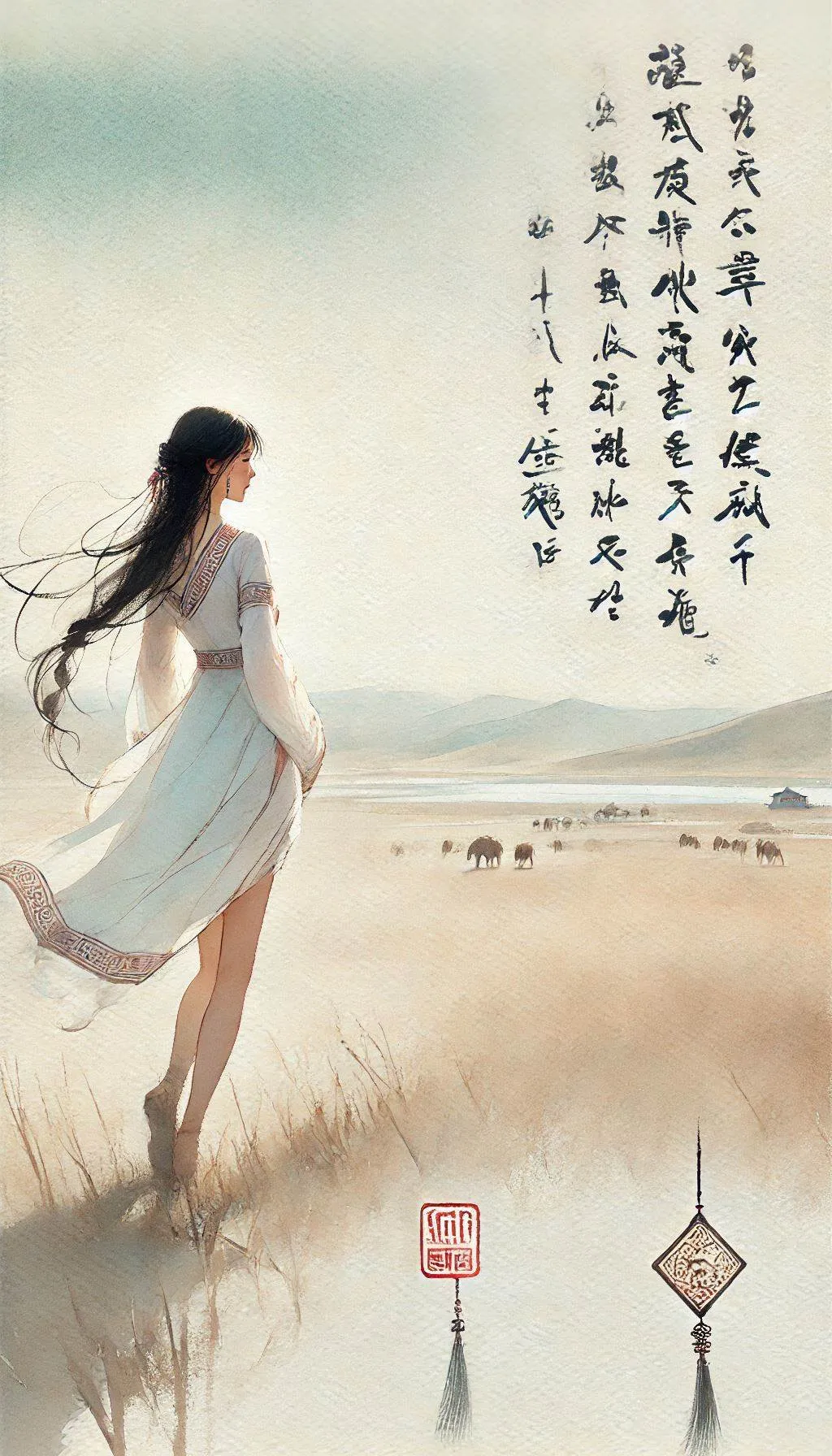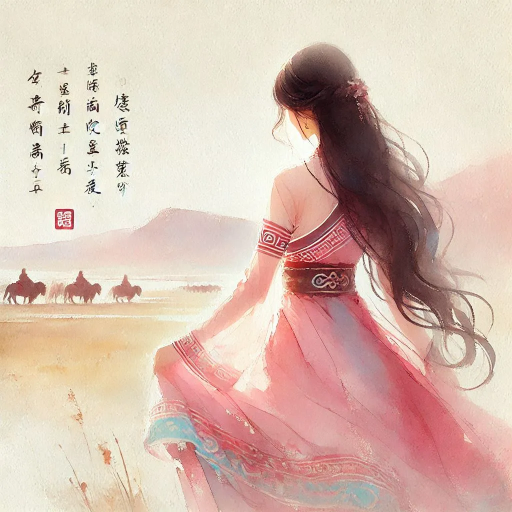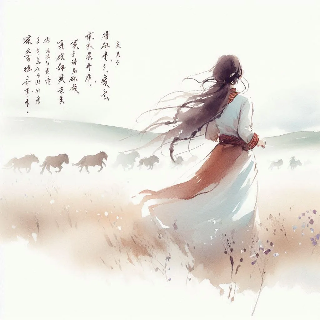 簡約朦朧水彩畫,一名跳舞美態蒙古少女大特寫,背向日蒙古大草原,留白位置手寫兩句中文詩句