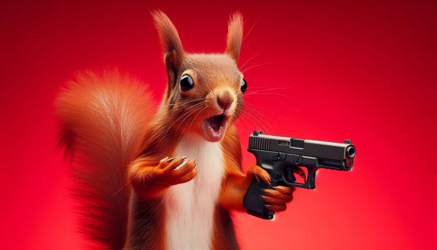 A very realistic studio scene of a red squirrel with a small Glock . The squirrel is standing with a Glock drawn and aimed. The squirrel has a very menacing expression and shouts at the bandit to surrender. photo looks real, super realistic details. Studio is vibrant red.