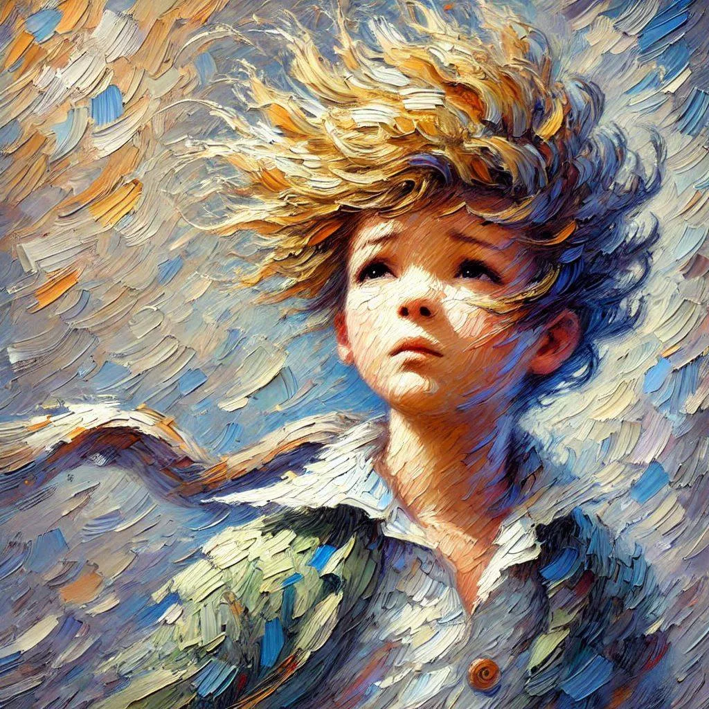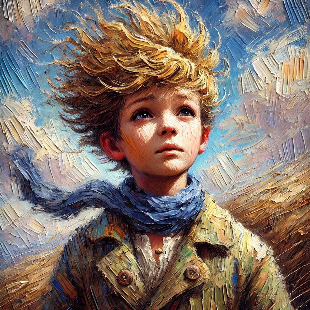 The Little Prince with wind-blown hair, thick brushstrokes, impasto style, expressive art