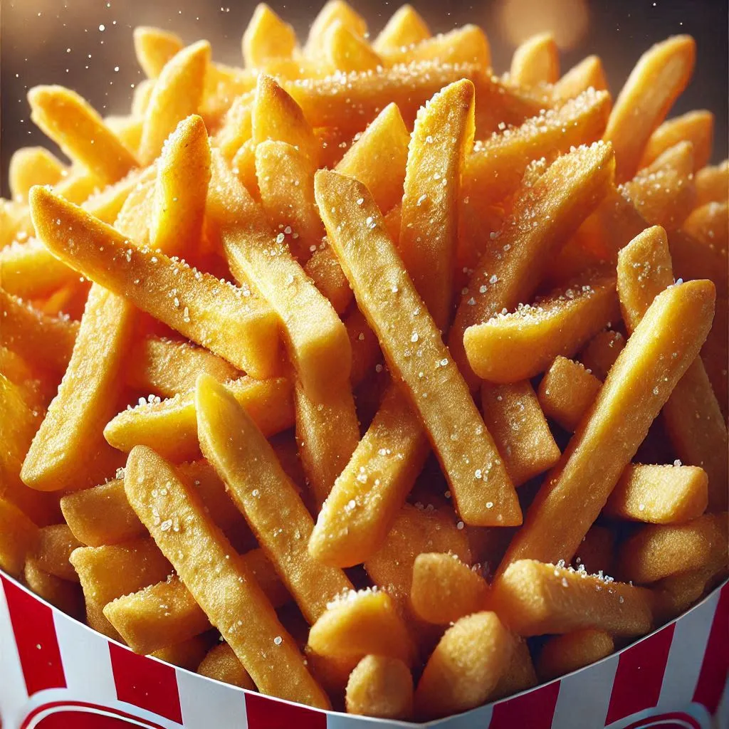 A hyperrealistic close-up photograph of a pile of perfectly golden-brown, crispy french fries, overflowing from a classic red and white paper fast-food container. The fries are of varying shapes and sizes, some long and slender, others short and stubby. Each fry is meticulously detailed, with visible salt crystals and tiny flecks of potato skin. The background is a soft, blurred bokeh, focusing all attention on the texture and detail of the fries.