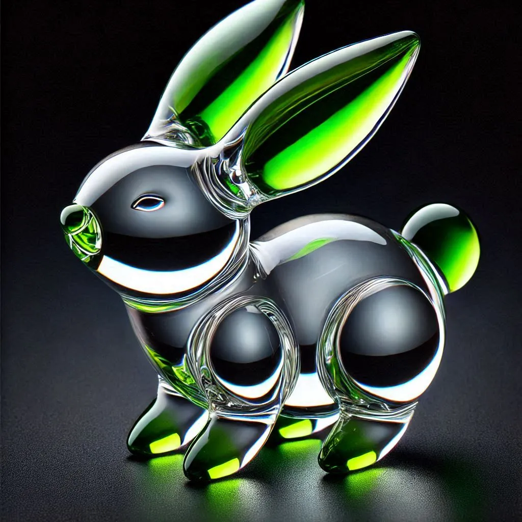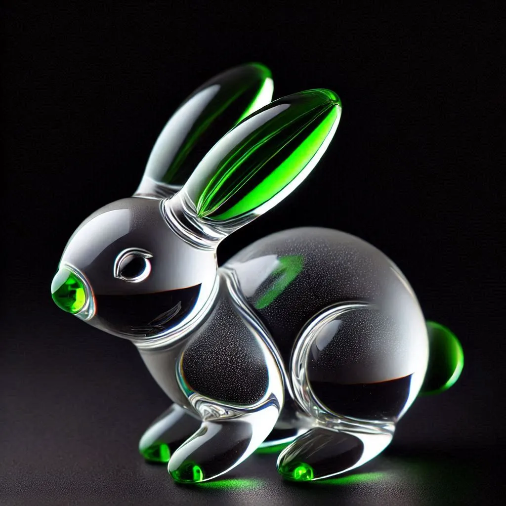 clear glass rabbit with translucent body, featuring vibrant green ears and a green tip on its trunk, set against a solid black background. The rabbit’s body reflects light, creating a shimmering effect, while the green accents add a playful touch to the overall composition.