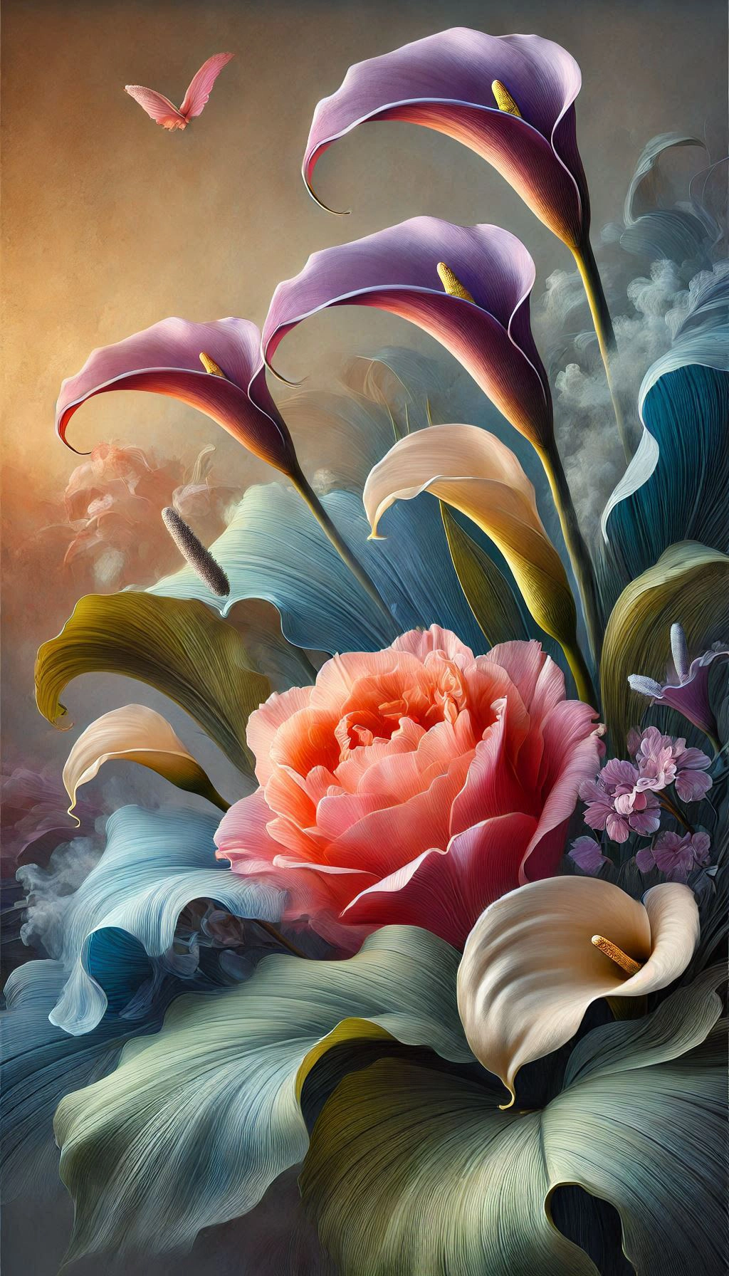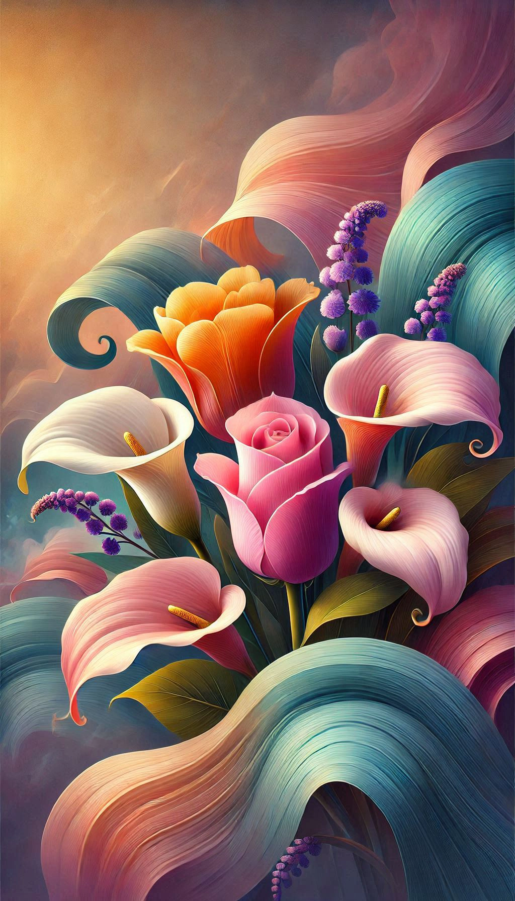 visually stunning digital artwork, flowers, large, blooming tulip, shades, pink, orange, delicate calla lily, small, charming violet, nestled, backdrop, soft, flowing blue-green leaves, depth, texture,