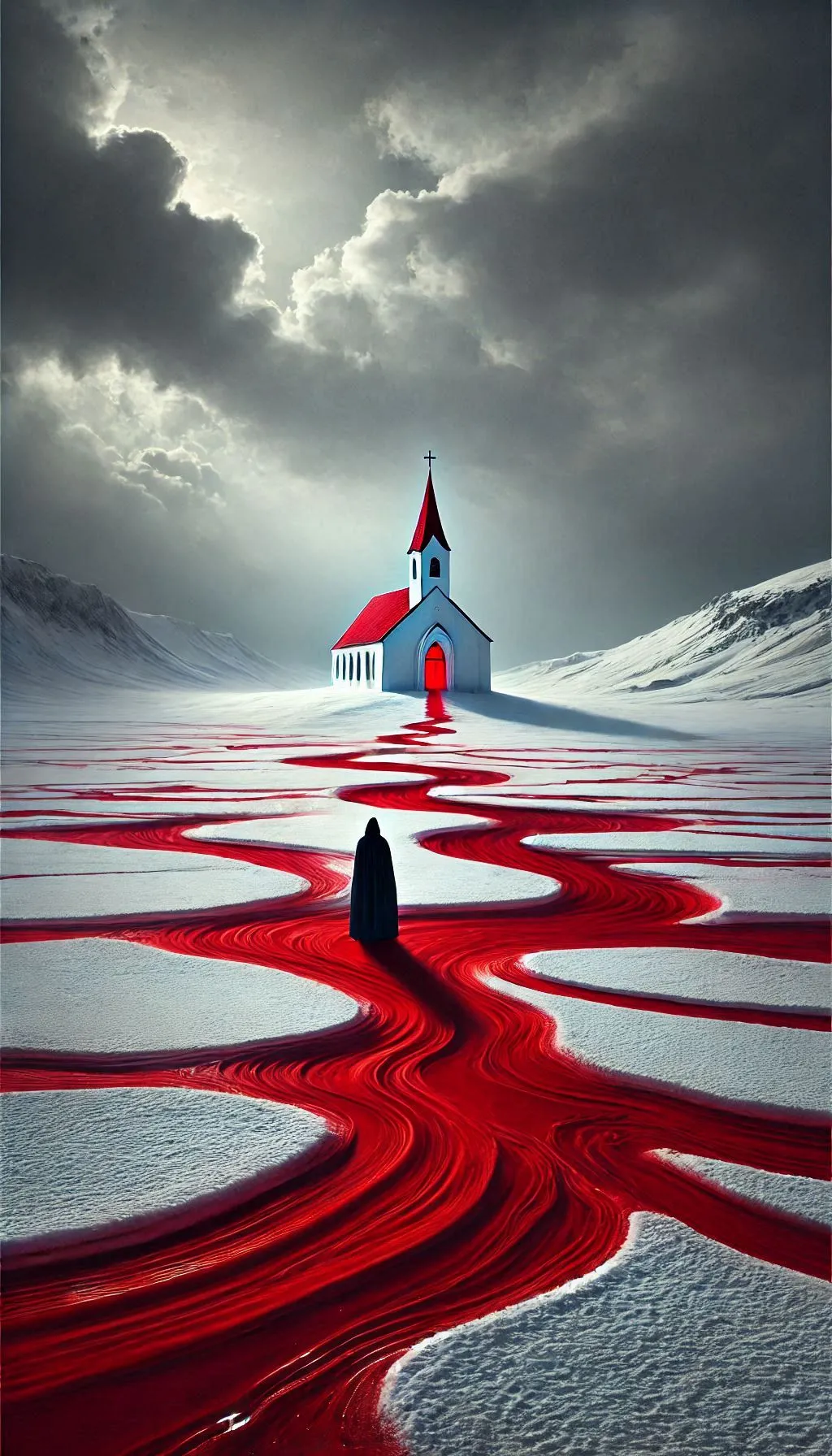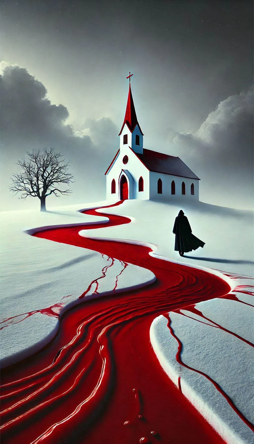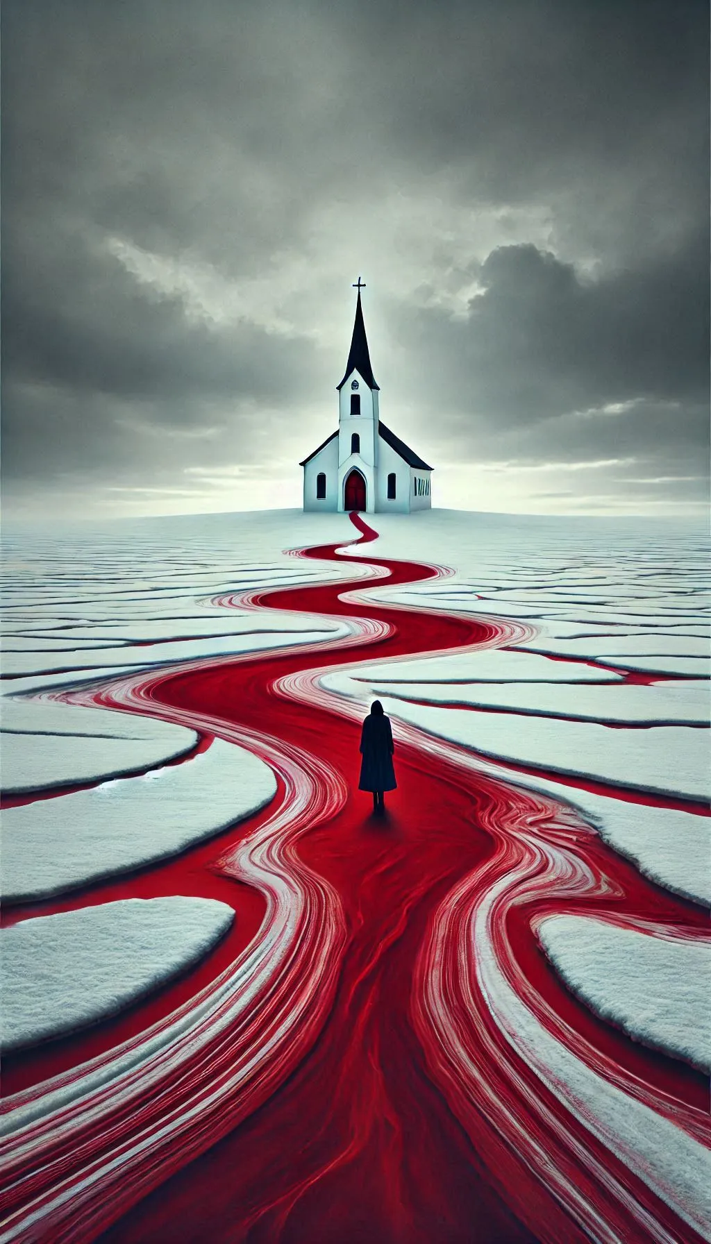 A lone figure in a dark cloak walks along a zigzag vivid red path of liquid against a stark white snowy landscape, leading toward a white church with a red entrance, under a cloudy sky with the eerie atmosphere. The scene evokes a sense of mystery and foreboding.