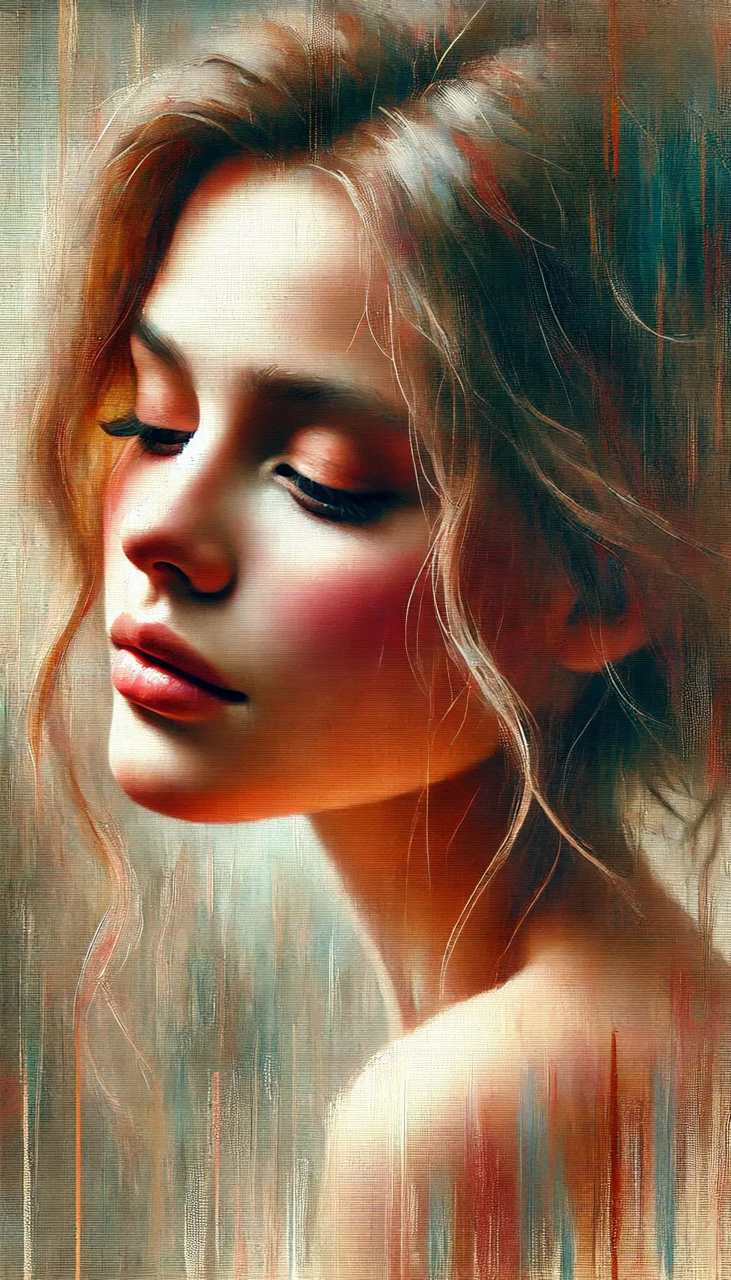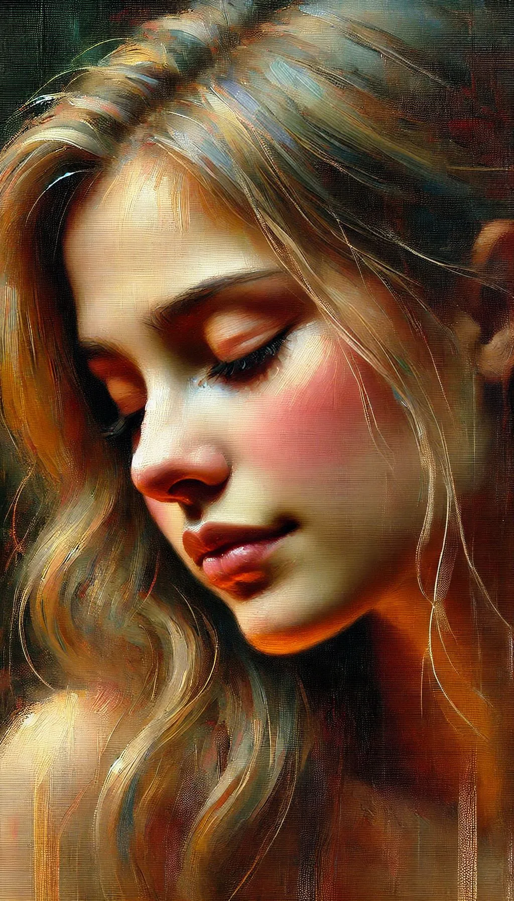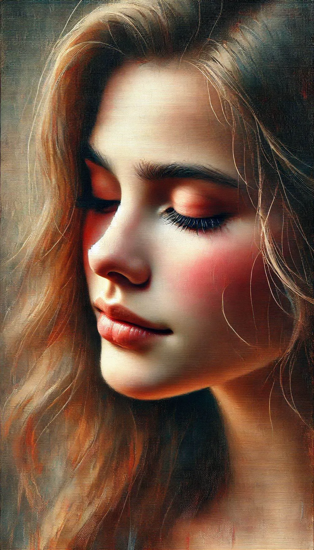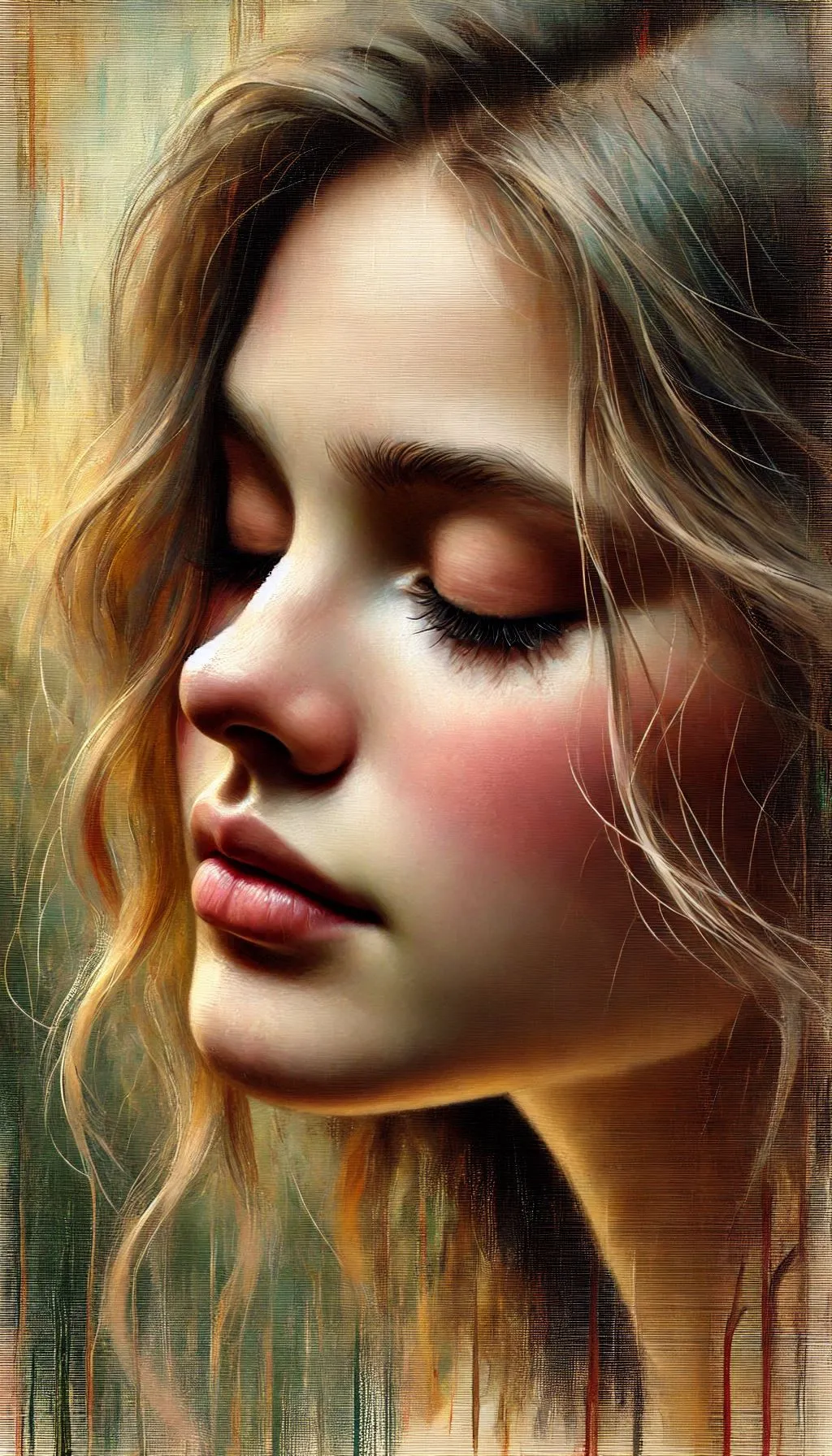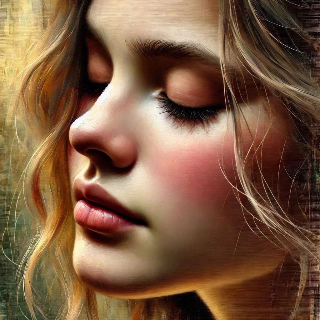 close up, a soft, intimate portrait of a young woman with delicate features, her eyes is closed thoughtfully to the side. Emphasize her serene expression, with radiant skin tones highlighted by gentle, warm lighting. muted colors transitioning into warm tones, capturing the texture of her flowing hair with light brush strokes, set against a blurred, atmospheric background that evokes emotion and depth. neo impressionist acrylic painting by William Holman Hunt