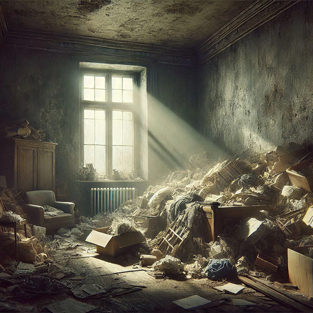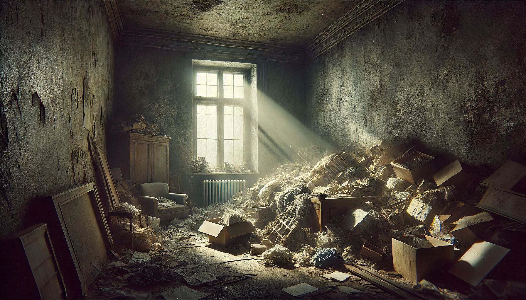 A dilapidated room, the walls covered in grime and decay, casting an oppressive atmosphere. Piles of discarded items litter the floor – broken furniture, crumpled papers, and various detritus. The room is bathed in a lone, muted sunbeam, the only source of light, casting a somber, melancholic glow. The scene conveys a sense of abandonment and hopelessness, with the sparse, weathered furnishings and the overwhelming clutter creating a palpable sense of desolation. Blend elements of Expressionism, with its emotive use of color and distorted forms, and Chiaroscuro, the dramatic interplay of light and shadow, to amplify the bleak and melancholic tone.