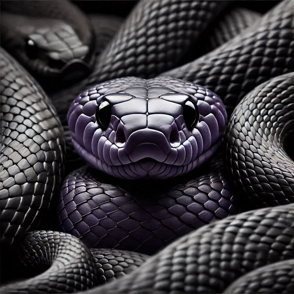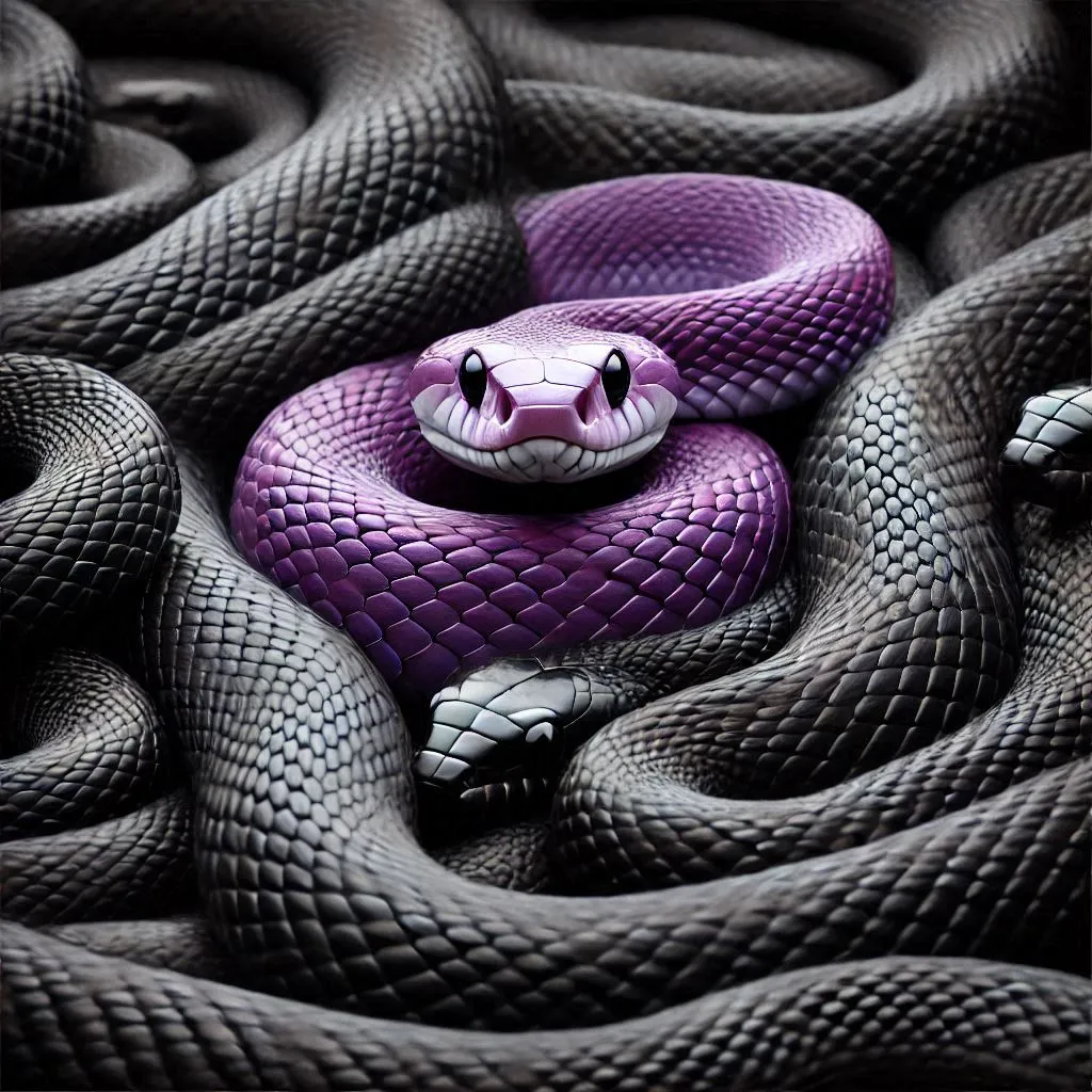 Studio portrait, violet snake centered among dense black snakes. Every part with detail under precise lighting. the animal gazes directly at viewer, its form sharply contrasting against surrounding others. Style echoes Knight and Sieff’s high-contrast editorial work. 8K resolution captures each part. Composition emphasizes isolation and dramatic tension.