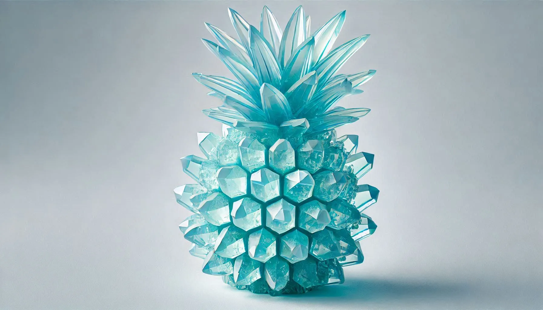 studio photo of transparent cyan ananas all made of irregular crystals from geode. Ananas lies on a white studio background.