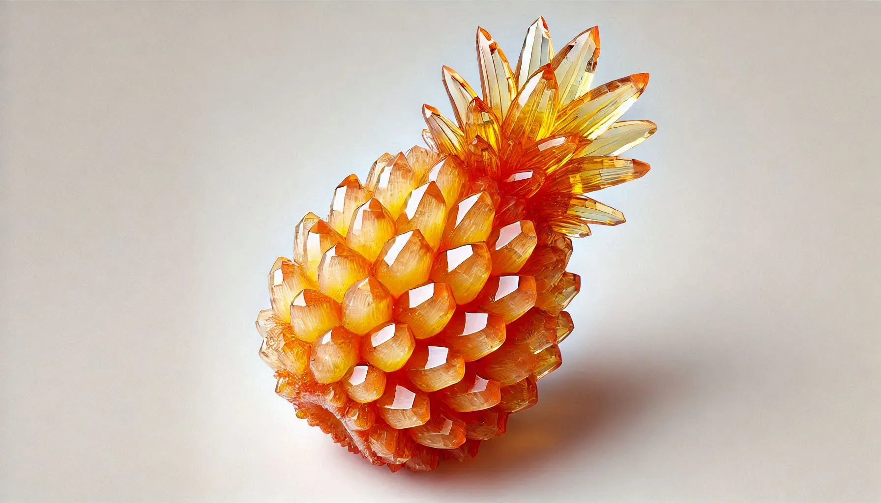 studio photo of transparent orange ananas all made of irregular crystals from geode. Ananas lies on a white studio background.