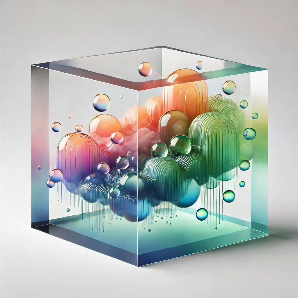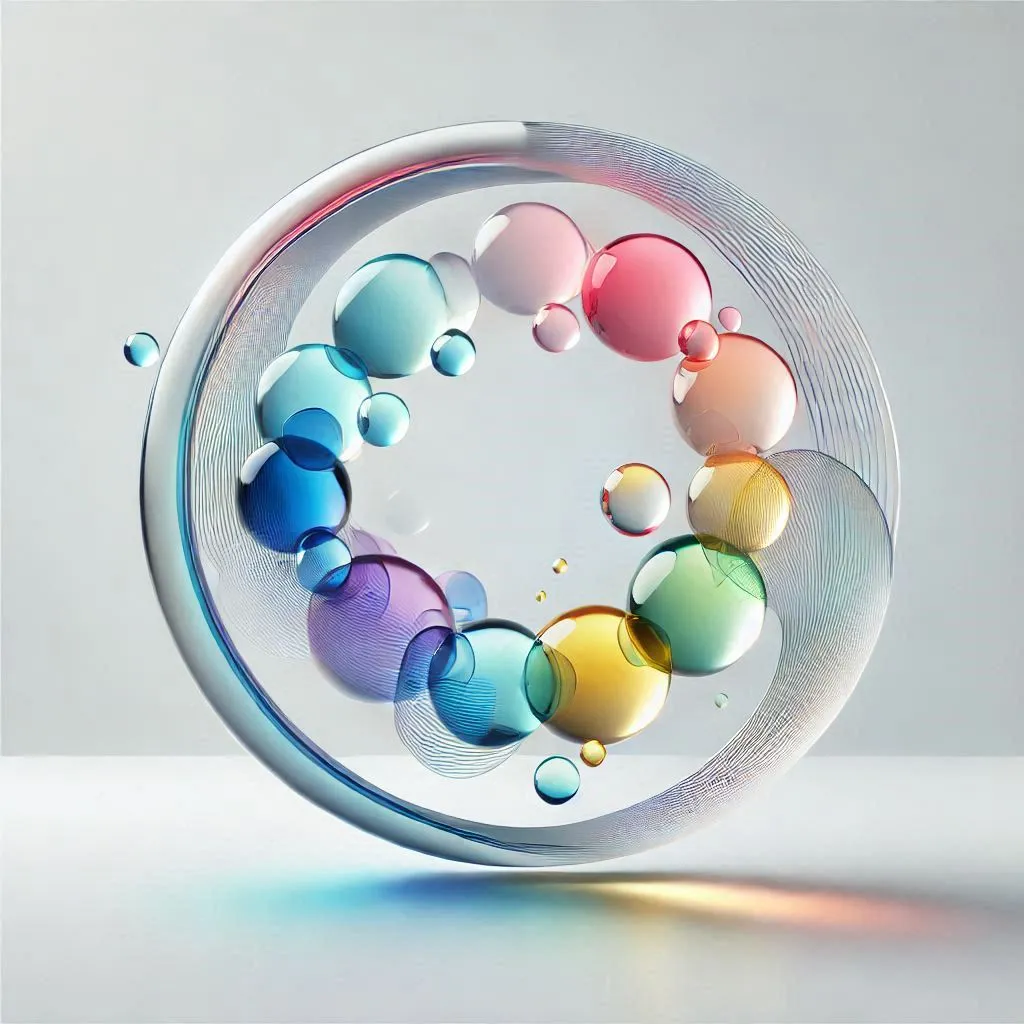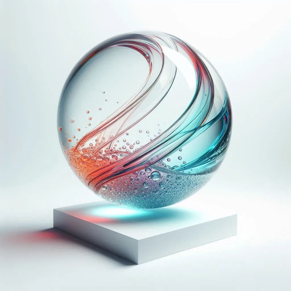 minimalist, transparent, 3D decoration piece made from water, vibrant colours, white background