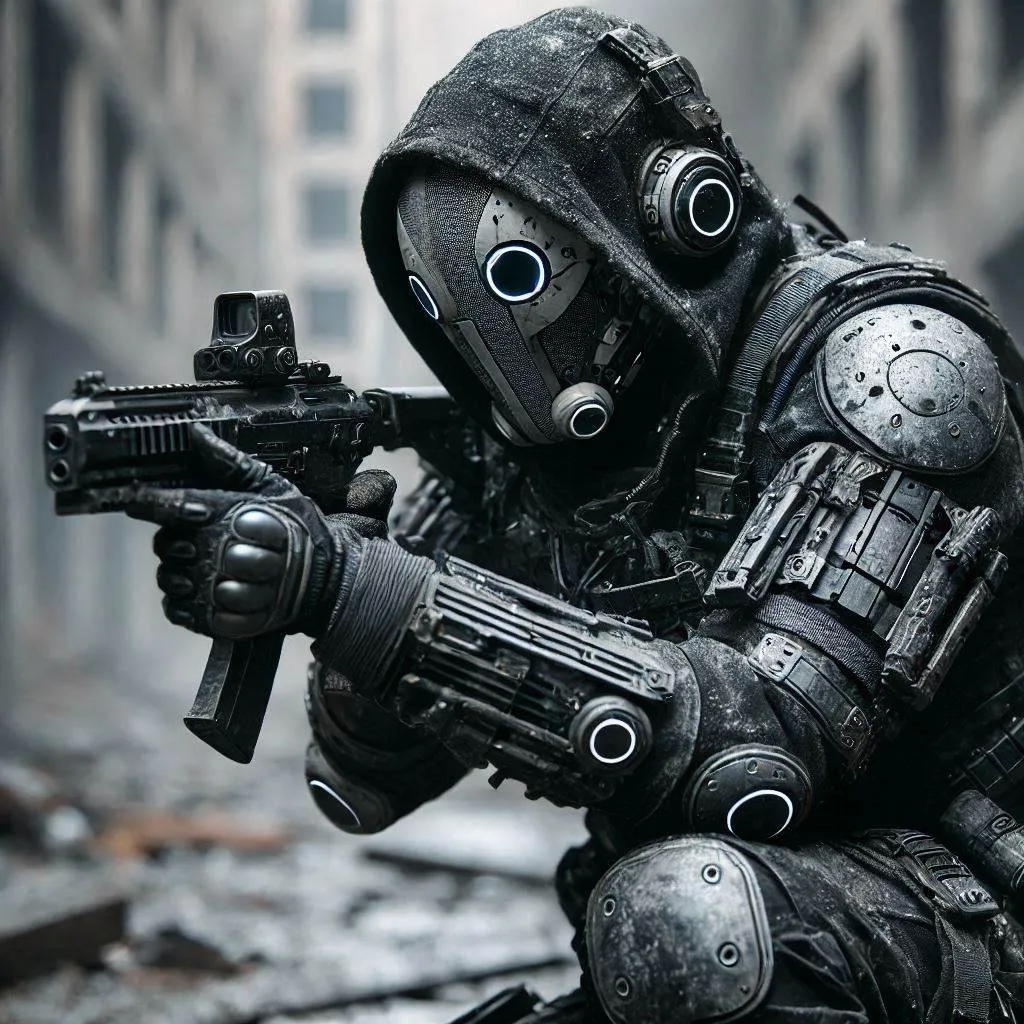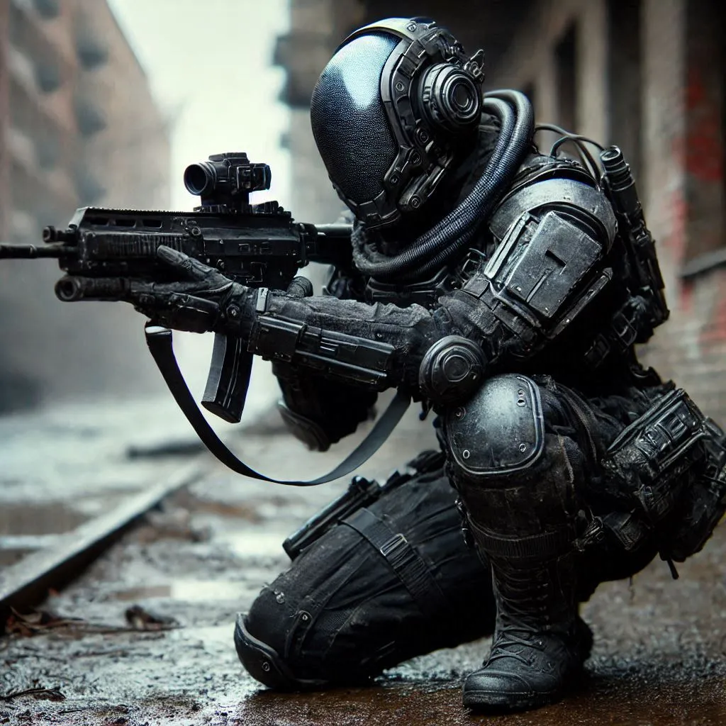 dirty black armed female in sci-fi battle armor with cybernetic helmet, aiming on one knee, mask, black coat, white csci-fi visor, bald head, armed figure, weapon in hand, aiming, plate armor, insulated armor, spacesuit, lots of small details, sci-fi movie style, on a ruined city street, overcast, photography, natural textures, natural light, natural blur, photorealism,cinematic rendering, ray tracing, highest quality, highest detail,Cinematic,Third-Person View,Blur Effect,