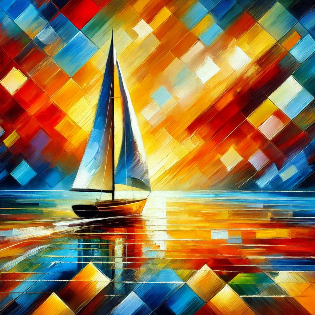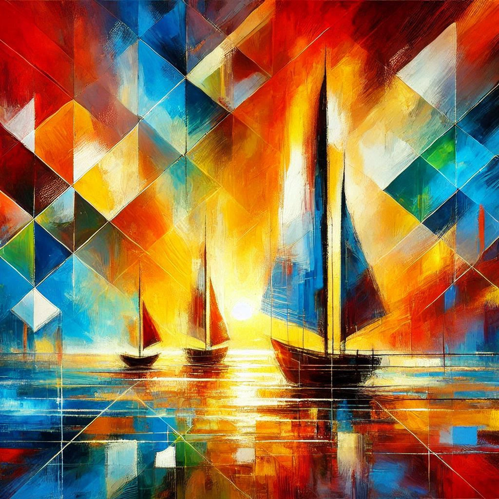 Sailboat, colorful waters, abstract painting, geometric shapes, bright color palette, reds, blues, yellows, greens, background, warm, cool tones, radiant sunset, sunrise, essence, movement, light, composition