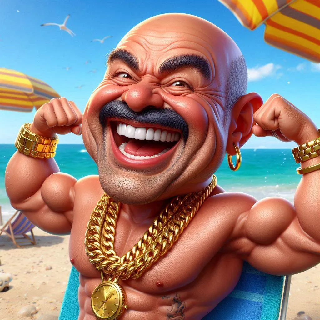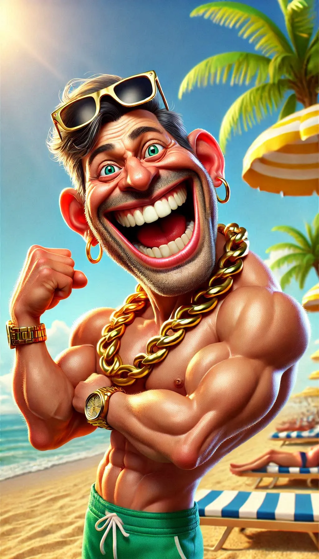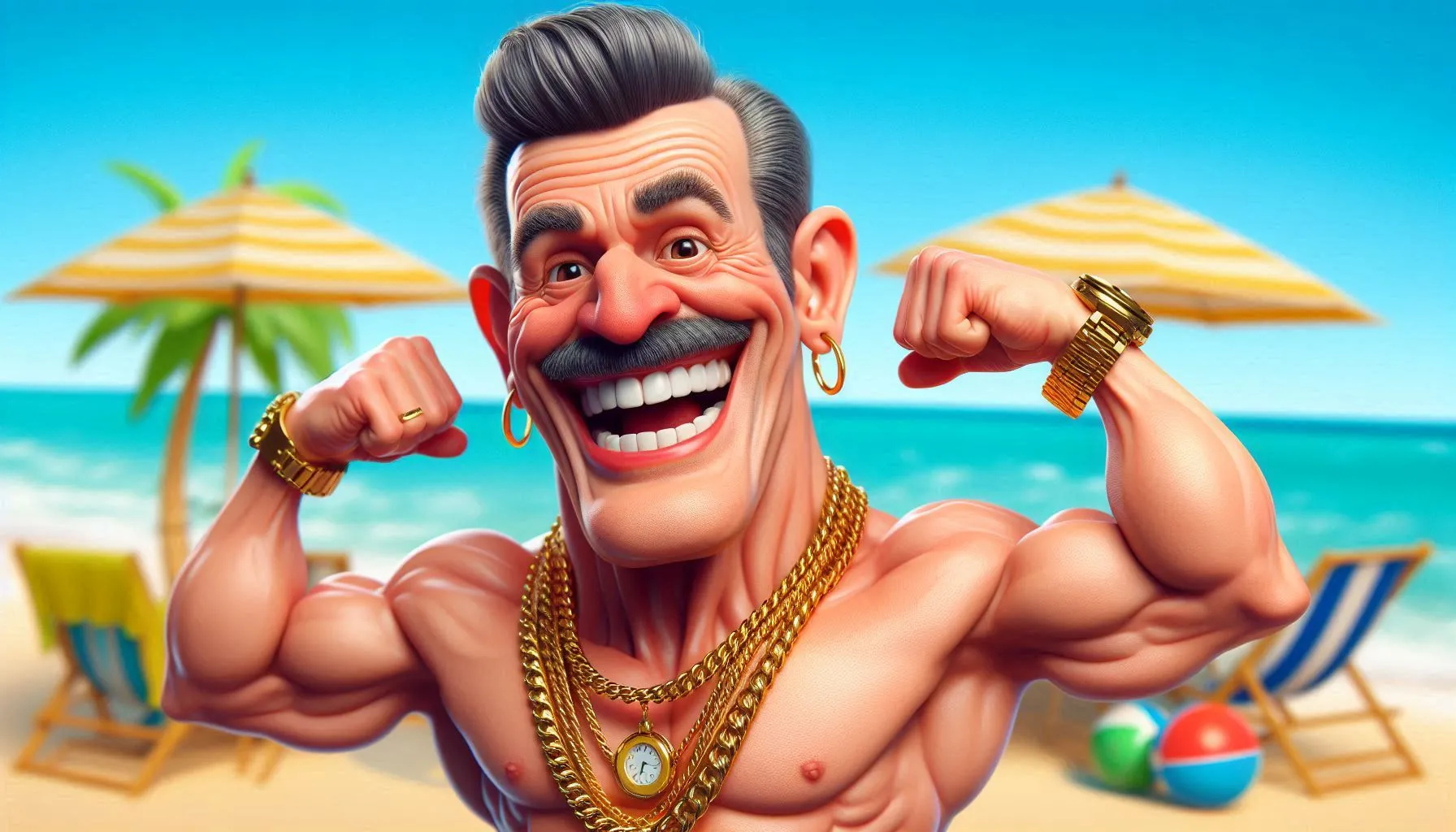 funny caricature, flamboyant beachgoer caricature, a male, 50 years old, joyful grin, big cartoonish head, exaggerated caricature features, laughing expression, wearing gold chain, gold wristwatch, flexing muscles, 3d digital caricature style with exaggerated proportions, vibrant colors, detailed skin texture, whimsical, playful, satirical, vibrant, comical display, sunny beach environment