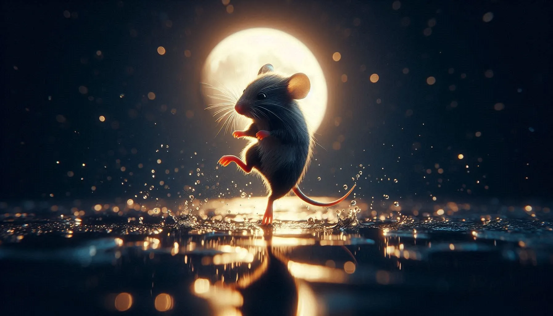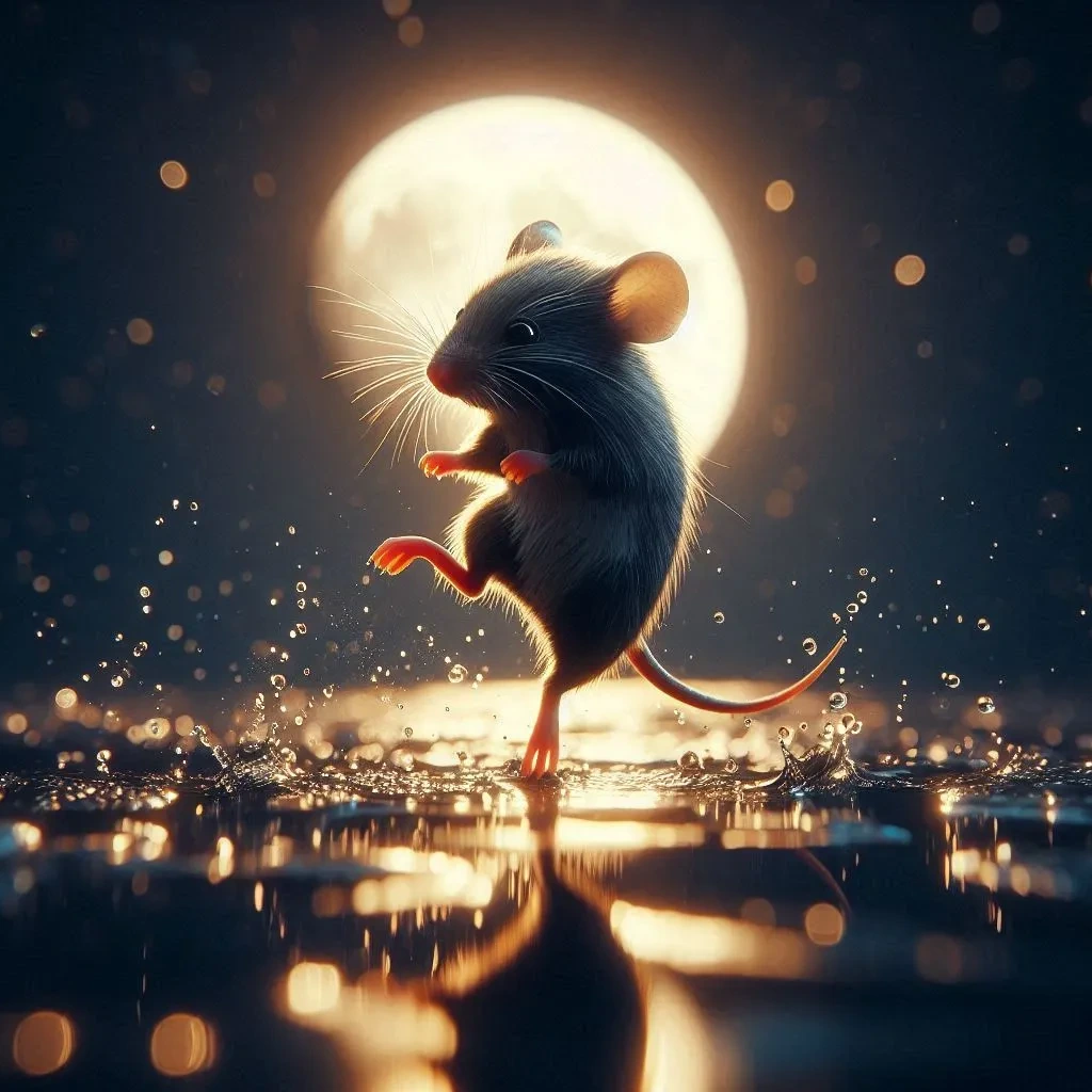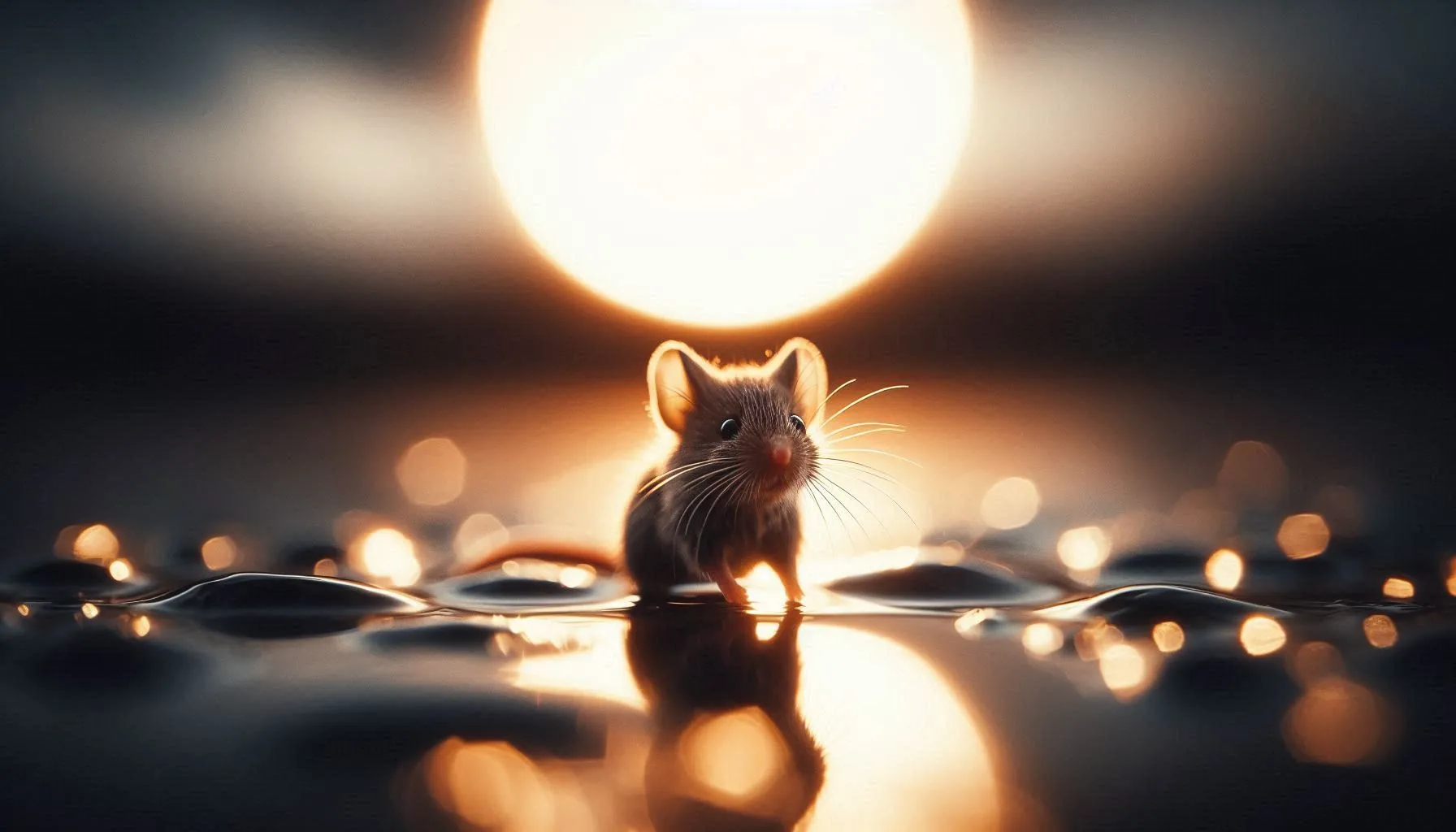 Low angle, close-up shot of a HD hyper realistic little mouse standing on top of puddles at golden hour. Intense jet black long exposure photography with motion blur, deep shadows, a moon reflecting on the puddles.