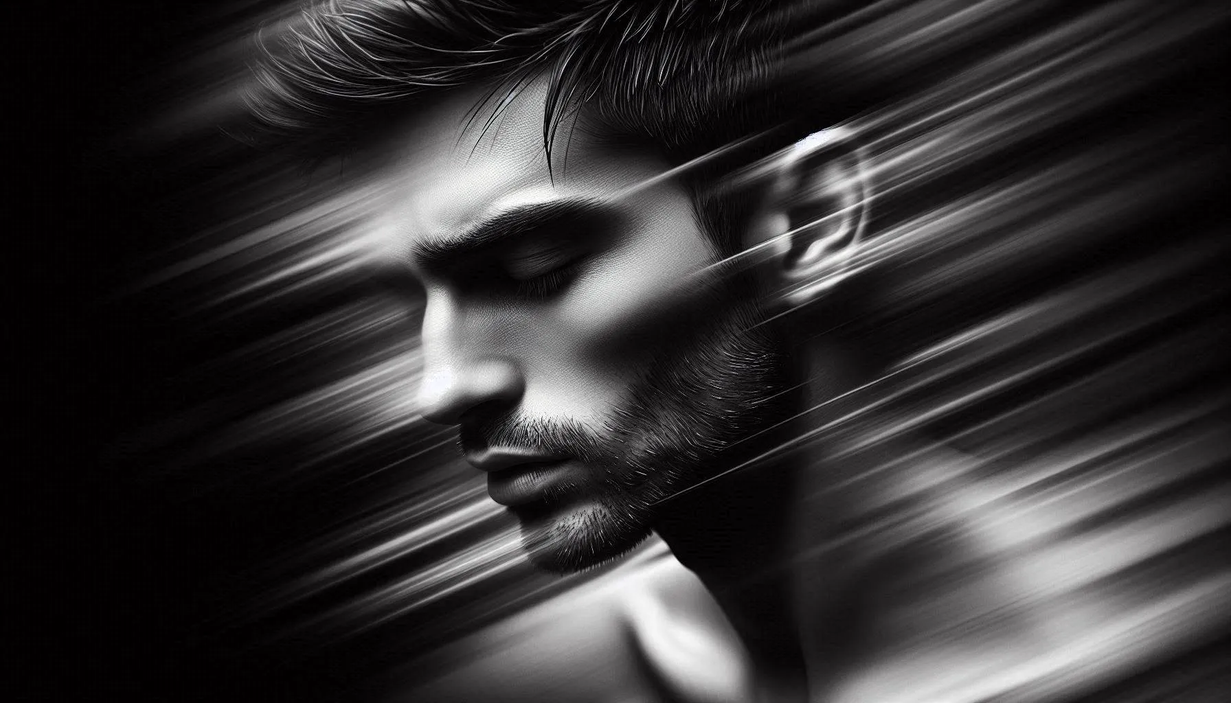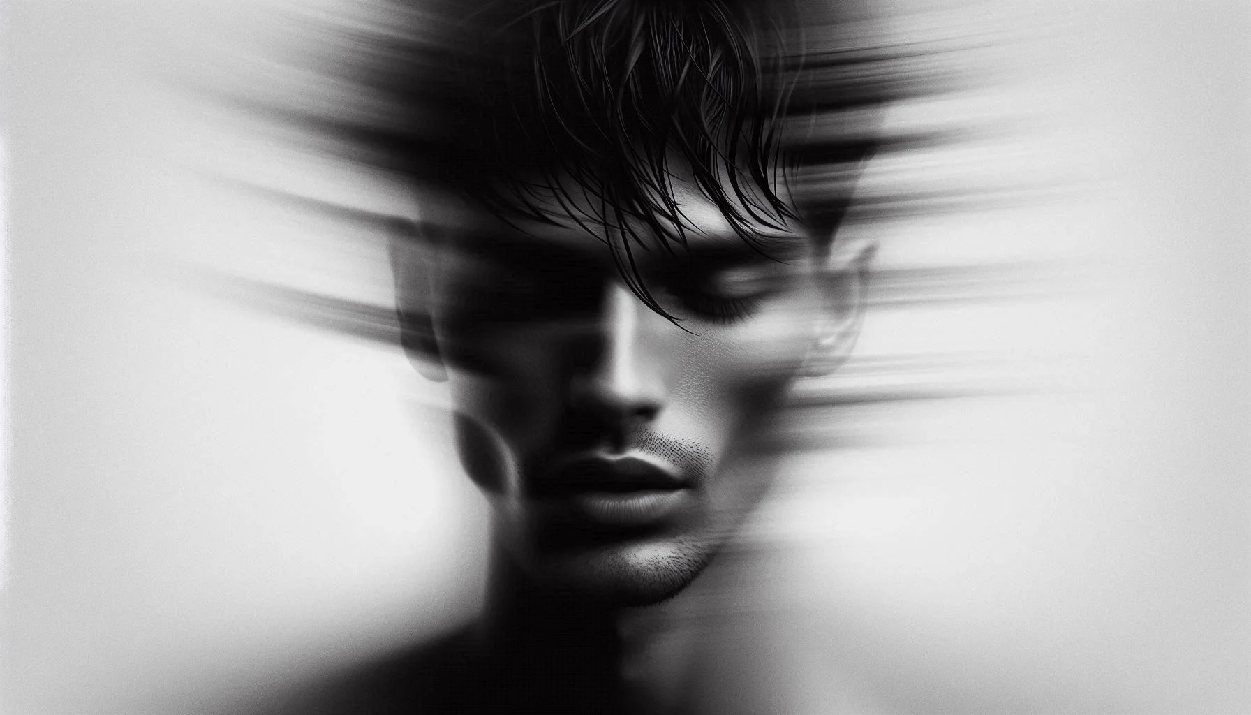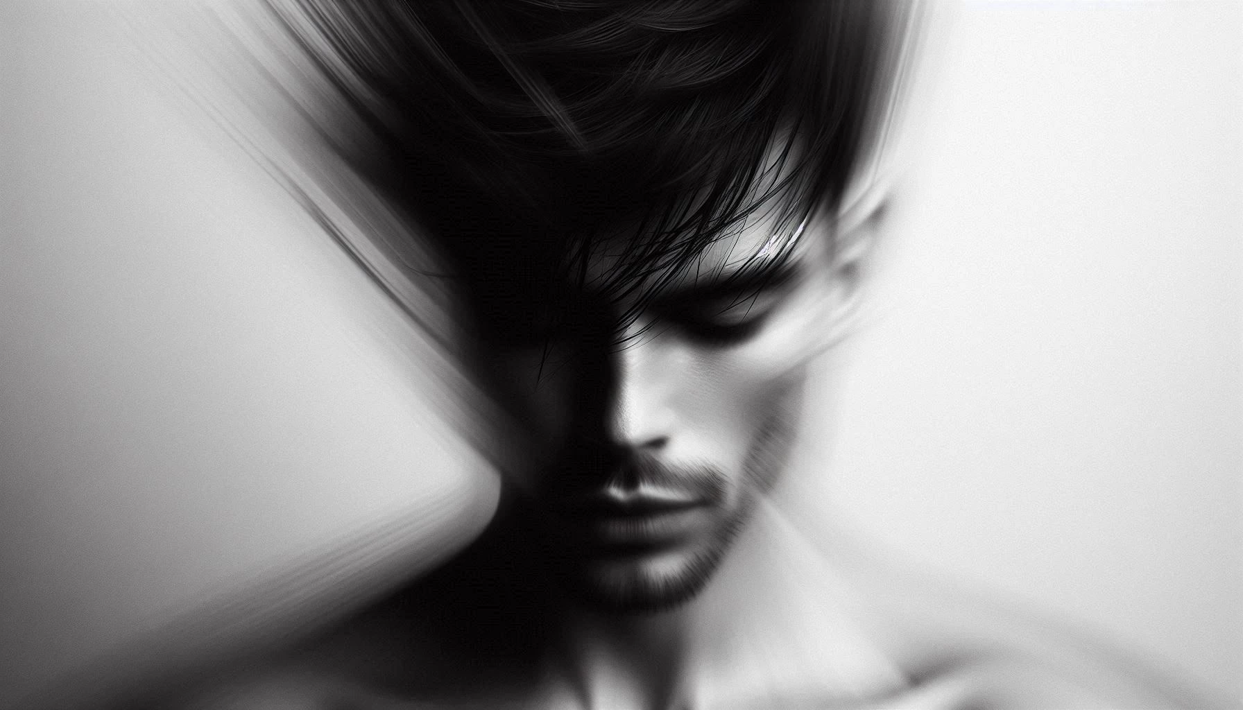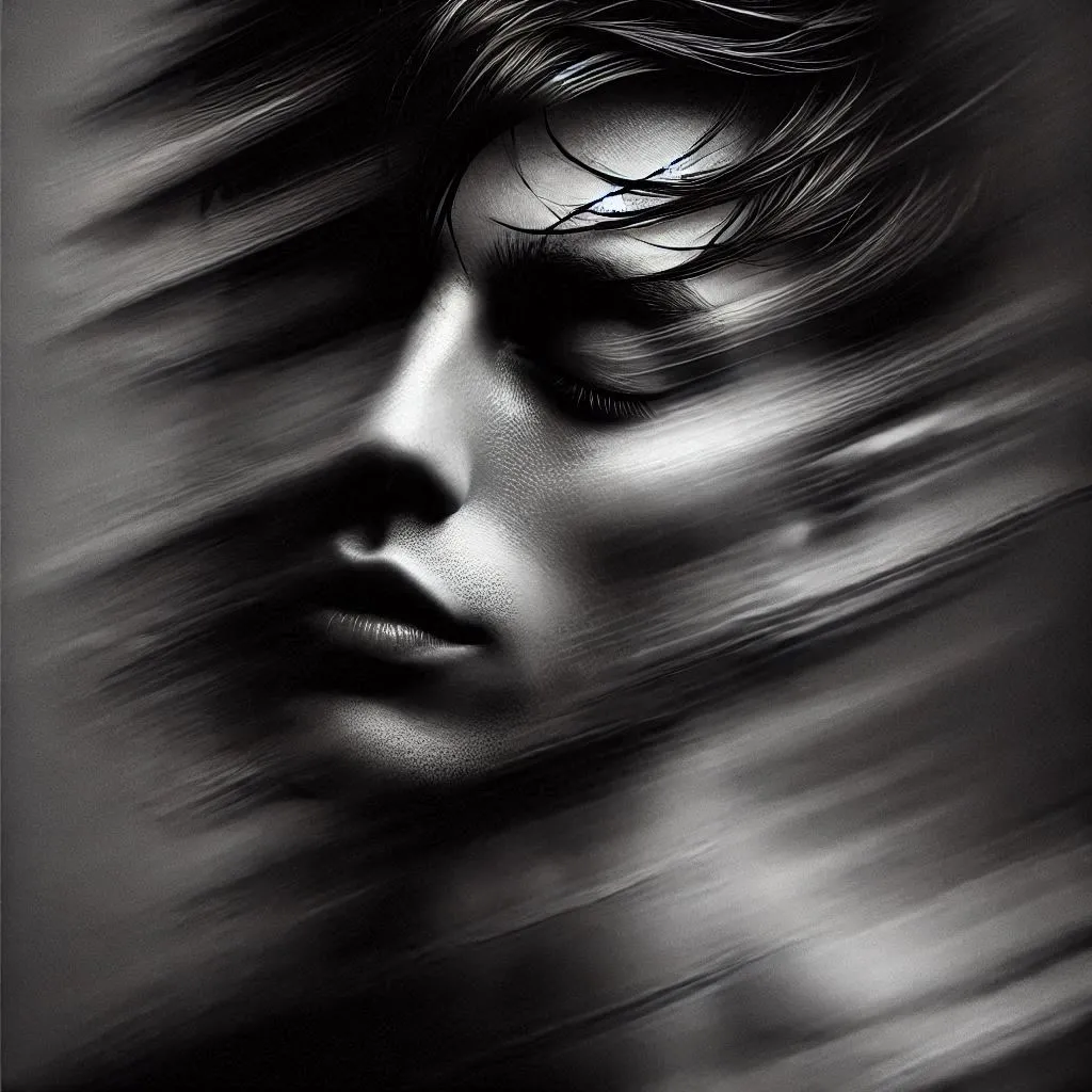 Motion blur effect was added to a close-up portrait of a polish person to create a dynamic distortion. The subject’s short black hair appears to be moving, further enhancing the dynamic composition. To create a dramatic and artistic atmosphere, the image is rendered in monochrome. The man’s face is partially hidden, his eyes closed and his expression calm, suggesting introspection and calmness. The blurred lines create a sense of fluidity and movement, giving the image an ethereal, dreamlike quality. The background is out of focus, drawing attention to the subject and the effect of movement.